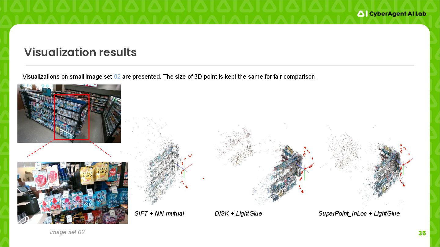 30. 35 Visualization results SIFT + NN-mutual DISK + LightGlue SuperPoint_InLoc
