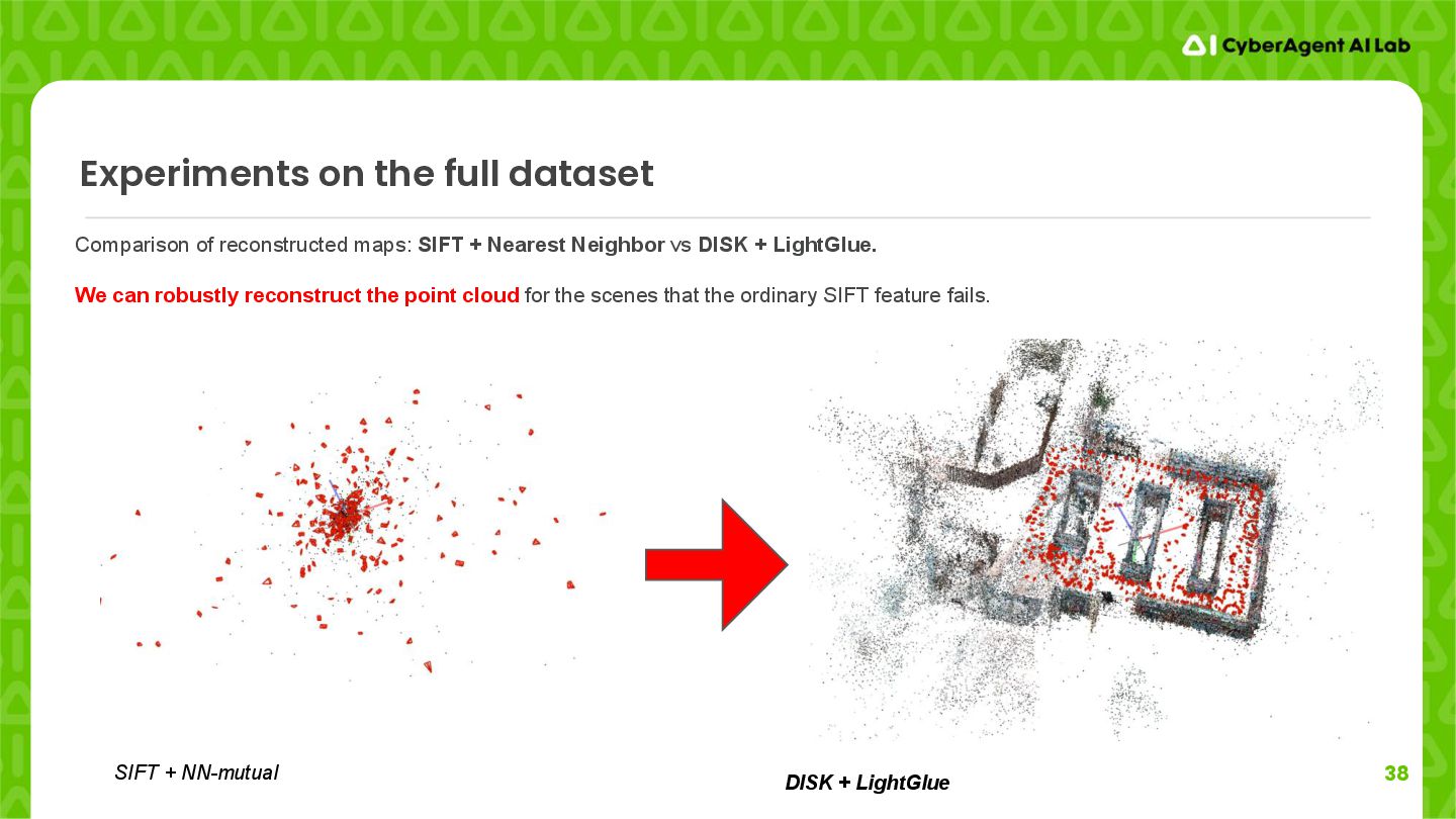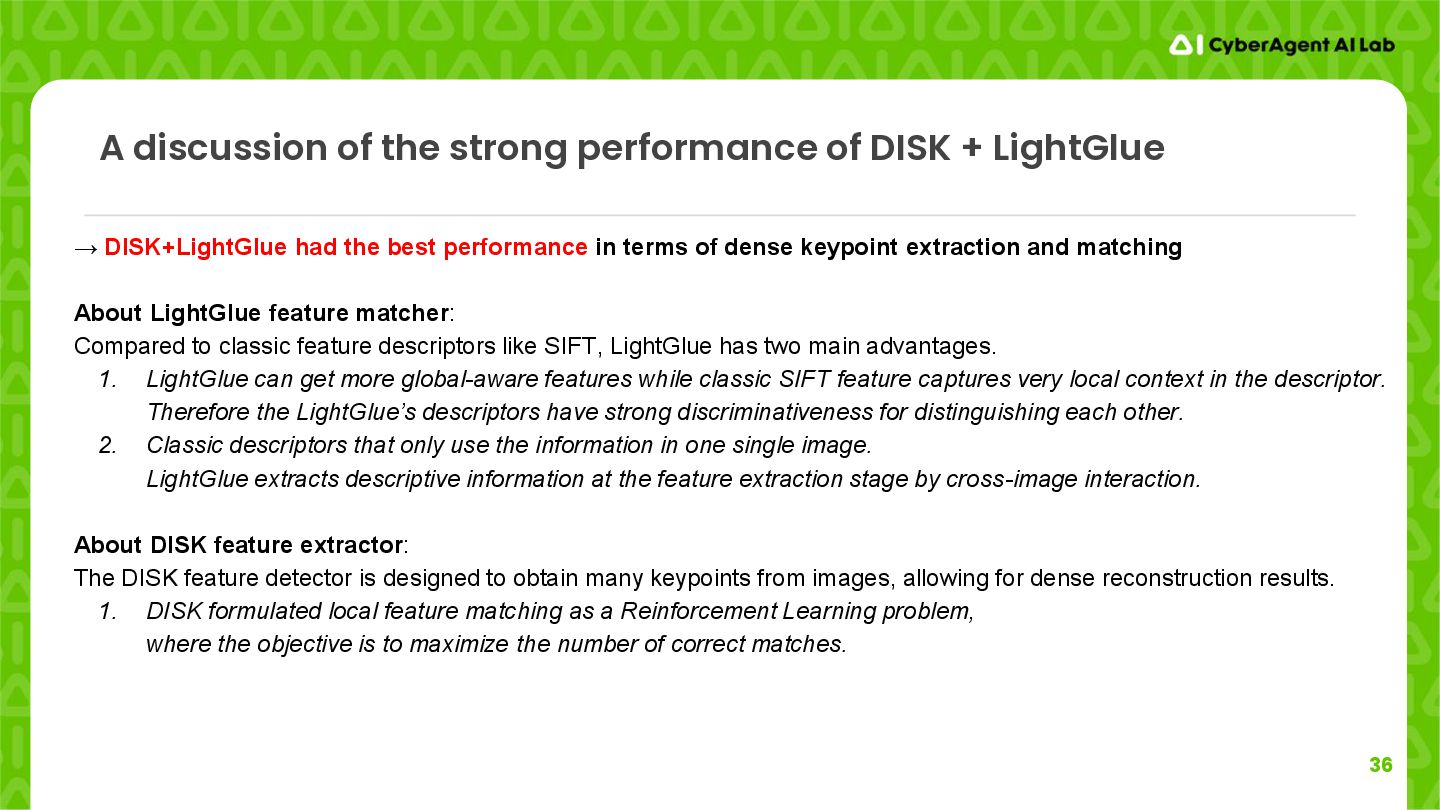 LightGlue → DISK+LightGlue had the best performance in terms of dense keypoint extraction and matching About LightGlue feature matcher: Compared to classic feature descriptors like SIFT, LightGlue has two main advantages. 1. LightGlue can get more global-aware features while classic SIFT feature captures very local context in the descriptor. Therefore the LightGlue’s descriptors have strong discriminativeness for distinguishing each other. 2. Classic descriptors that only use the information in one single image. LightGlue extracts descriptive information at the feature extraction stage by cross-image interaction. About DISK feature extractor: The DISK feature detector is designed to obtain many keypoints from images, allowing for dense reconstruction results. 1. DISK formulated local feature matching as a Reinforcement Learning problem, where the objective is to maximize the number of correct matches.