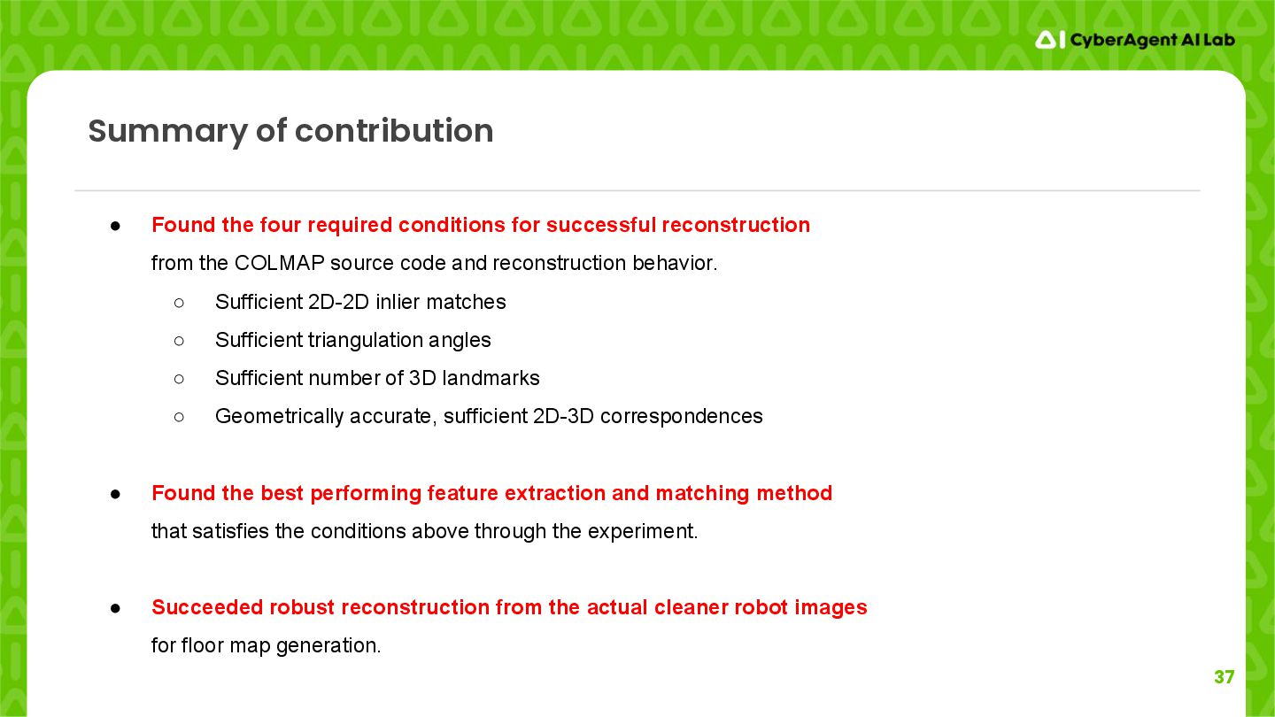 for successful reconstruction from the COLMAP source code and reconstruction behavior. ◦ Sufficient 2D-2D inlier matches ◦ Sufficient triangulation angles ◦ Sufficient number of 3D landmarks ◦ Geometrically accurate, sufficient 2D-3D correspondences • Found the best performing feature extraction and matching method that satisfies the conditions above through the experiment. • Succeeded robust reconstruction from the actual cleaner robot images for floor map generation.