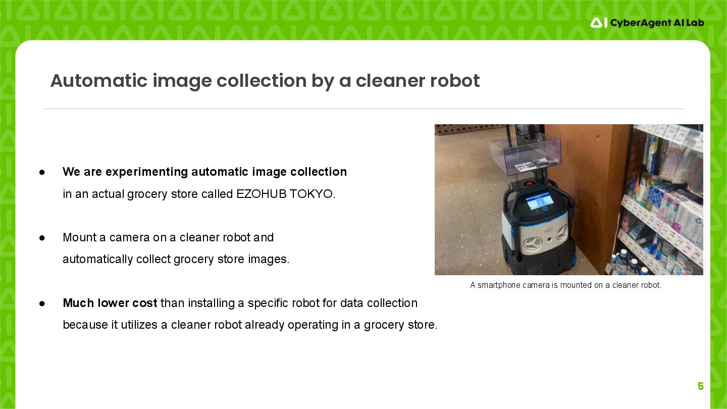 are experimenting automatic image collection in an actual grocery store called EZOHUB TOKYO. • Mount a camera on a cleaner robot and automatically collect grocery store images. • Much lower cost than installing a specific robot for data collection because it utilizes a cleaner robot already operating in a grocery store. A smartphone camera is mounted on a cleaner robot.