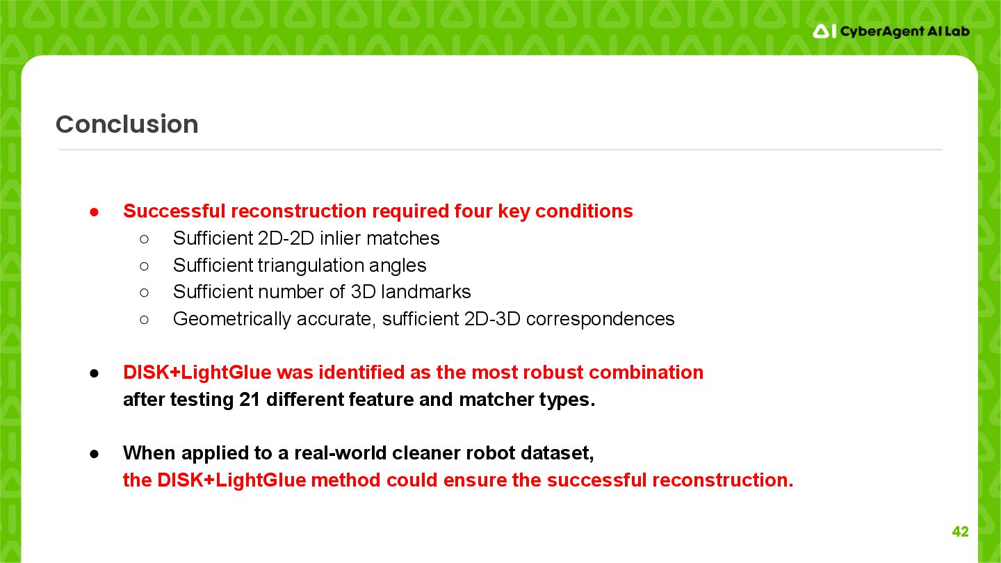 Sufficient 2D-2D inlier matches ◦ Sufficient triangulation angles ◦ Sufficient number of 3D landmarks ◦ Geometrically accurate, sufficient 2D-3D correspondences • DISK+LightGlue was identified as the most robust combination after testing 21 different feature and matcher types. • When applied to a real-world cleaner robot dataset, the DISK+LightGlue method could ensure the successful reconstruction.
