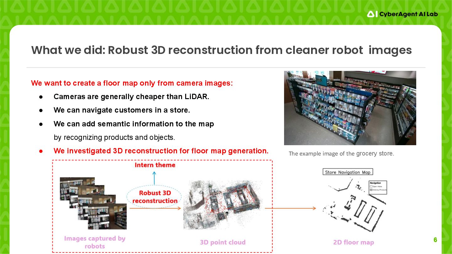 camera images: • Cameras are generally cheaper than LiDAR. • We can navigate customers in a store. • We can add semantic information to the map by recognizing products and objects. • We investigated 3D reconstruction for floor map generation. What we did: Robust 3D reconstruction from cleaner robot images The example image of the grocery store.