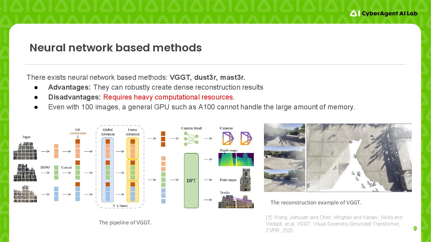 exists neural network based methods: VGGT, dust3r, mast3r. • Advantages: They can robustly create dense reconstruction results • Disadvantages: Requires heavy computational resources. • Even with 100 images, a general GPU such as A100 cannot handle the large amount of memory. [1] Wang, Jianyuan and Chen, Minghao and Karaev, Nikita and Vedaldi, et al, VGGT: Visual Geometry Grounded Transformer, CVPR, 2025. The reconstruction example of VGGT.