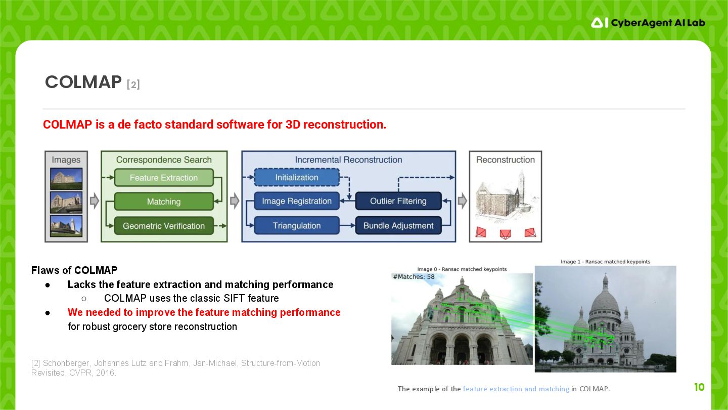 matching in COLMAP. COLMAP is a de facto standard software for 3D reconstruction. [2] Schonberger, Johannes Lutz and Frahm, Jan-Michael, Structure-from-Motion Revisited, CVPR, 2016. Flaws of COLMAP • Lacks the feature extraction and matching performance ◦ COLMAP uses the classic SIFT feature • We needed to improve the feature matching performance for robust grocery store reconstruction
