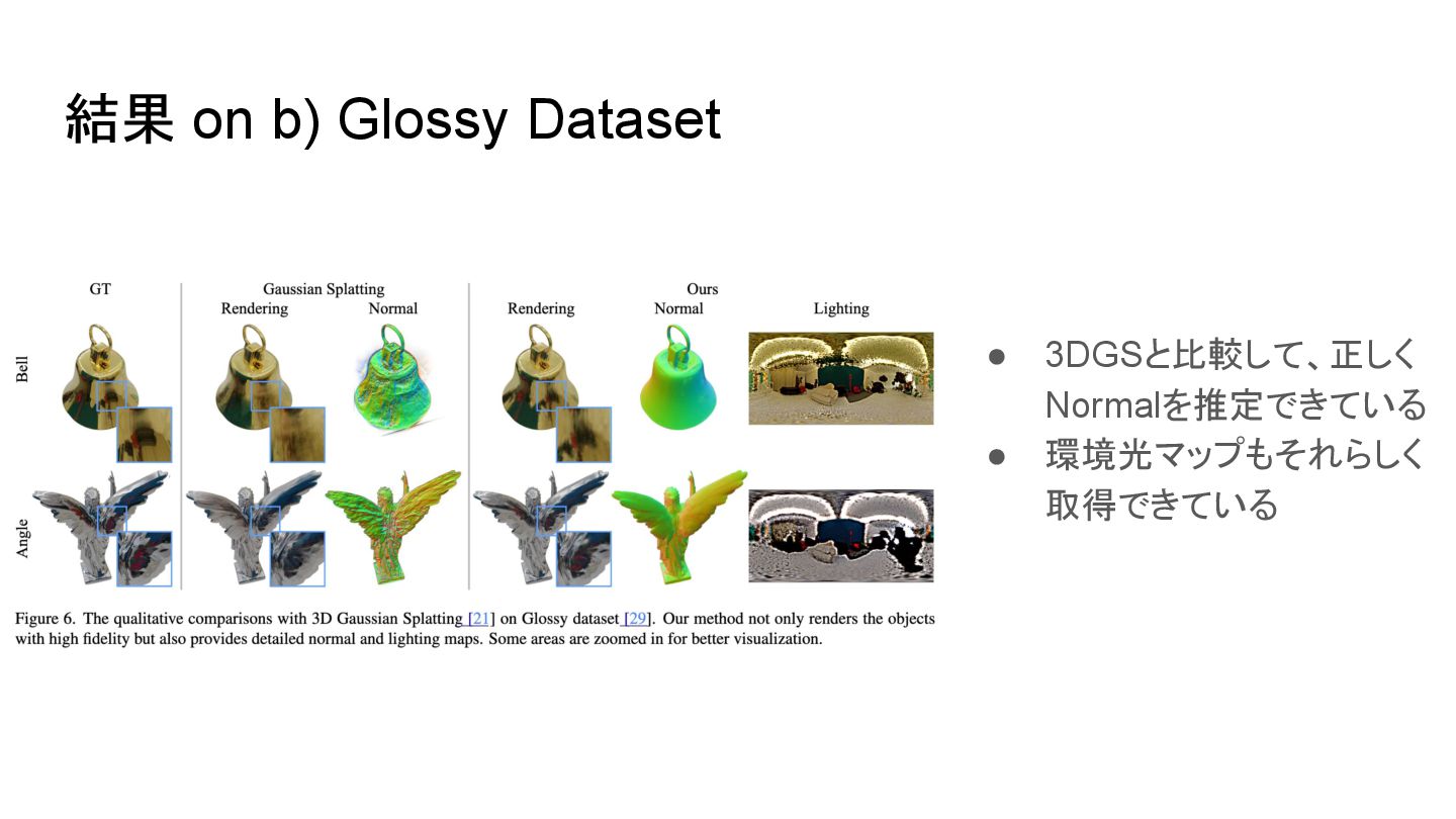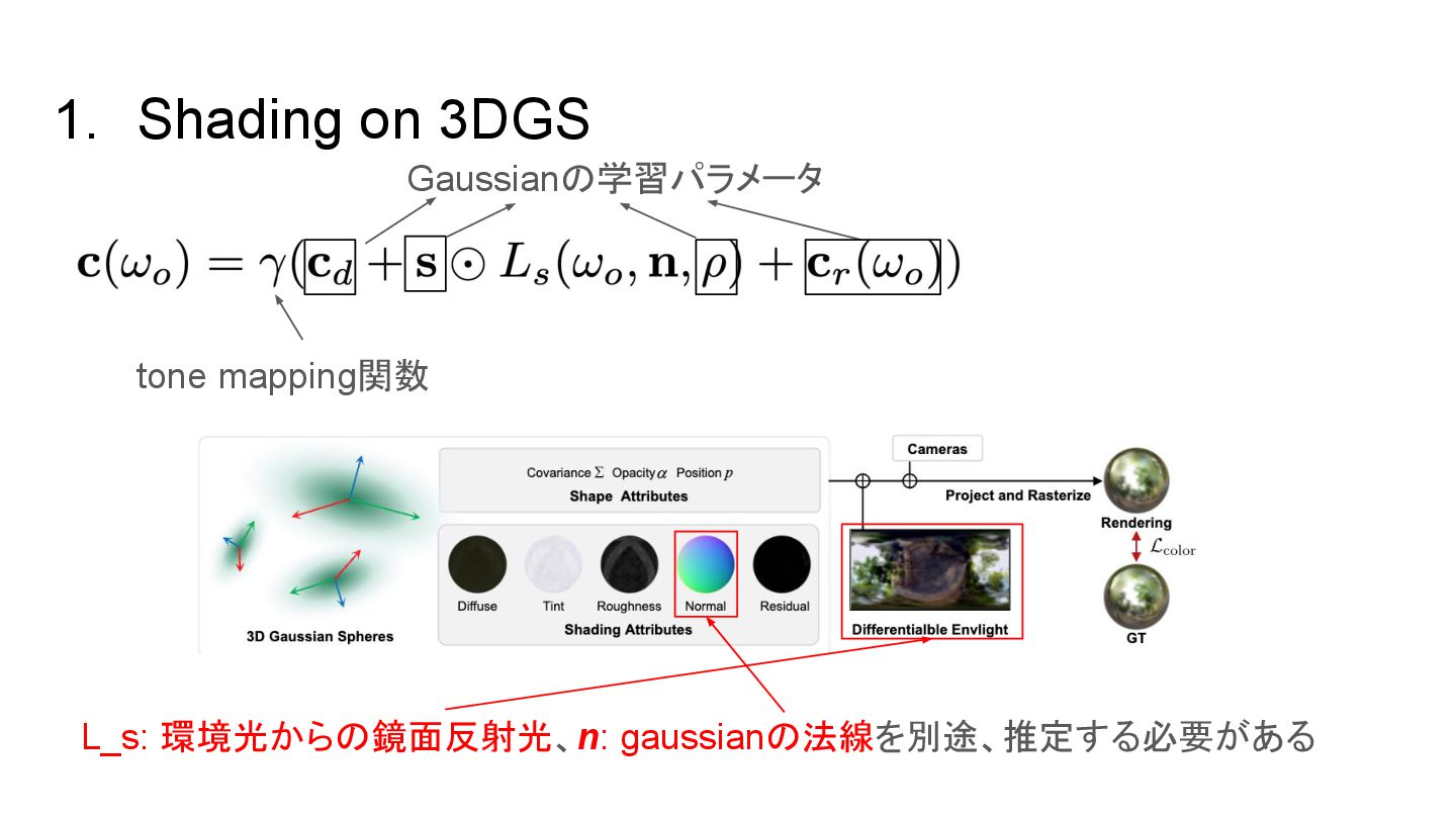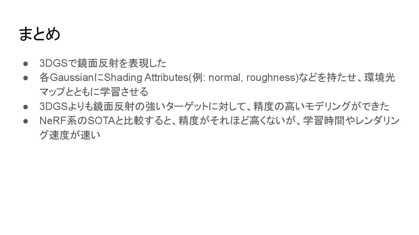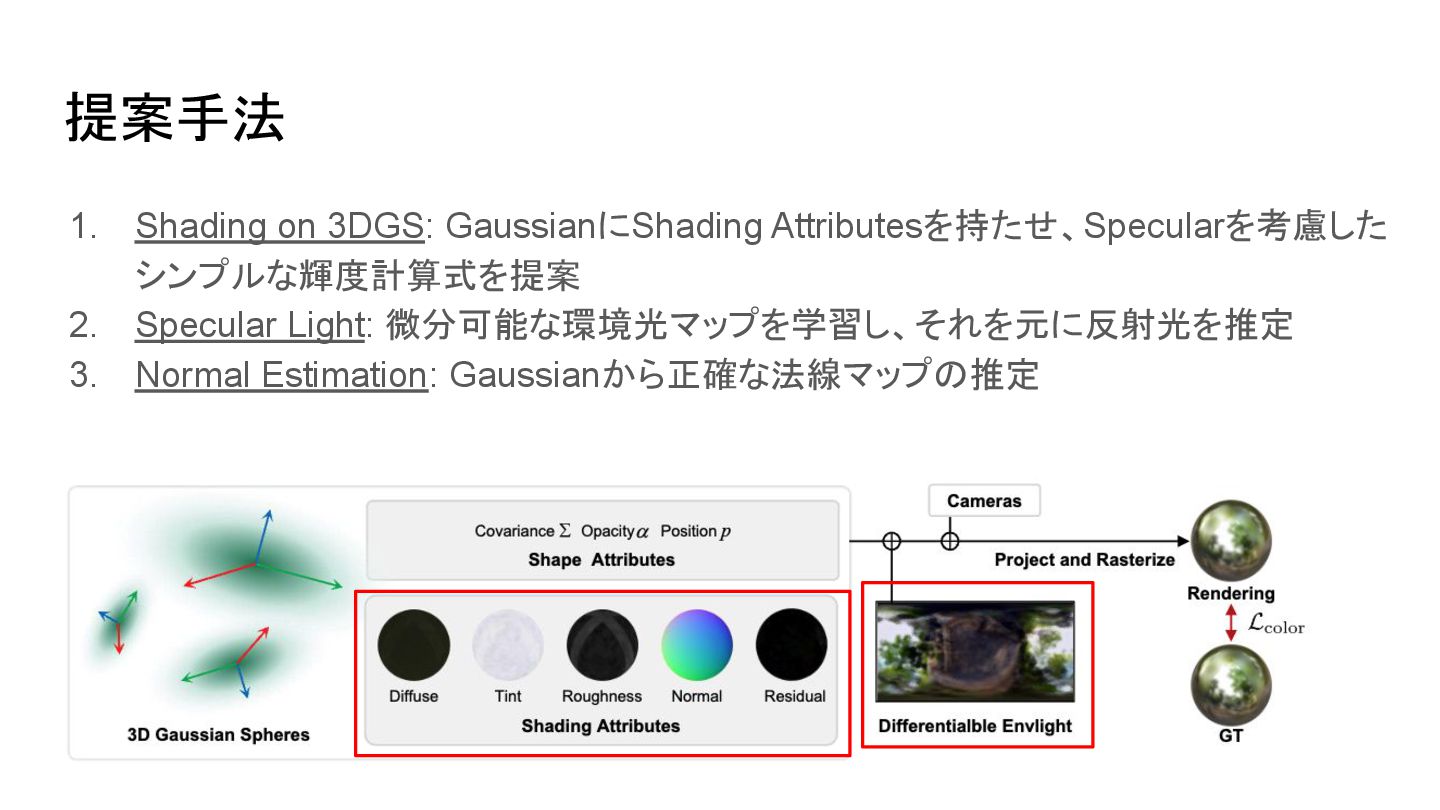 3D Gaussian Splatting(3DGS)において鏡面反射を表現するため、各Gaussianに法線や粗さなどのShading Attributesを付与し、環境光マップと組み合わせて学習を行った。この手法により、鏡面反射の強い物体を対象とした場合において、従来の3DGSよりも高精度な外観再現が可能となった。