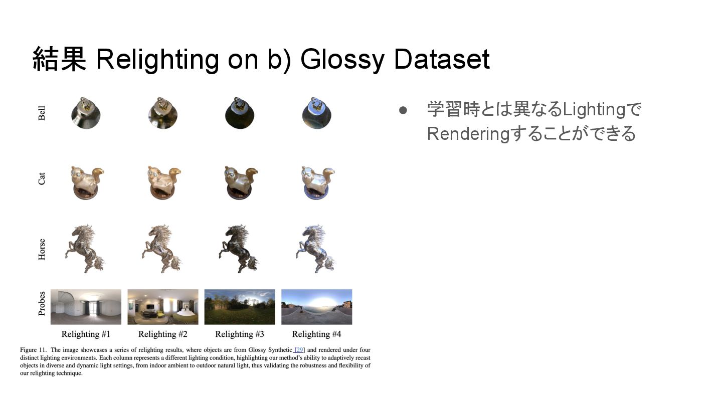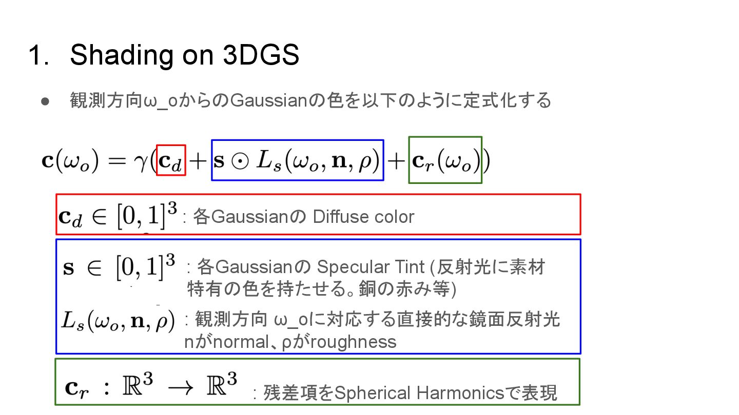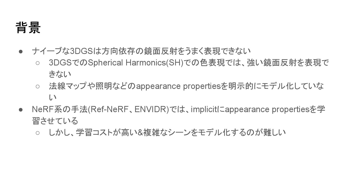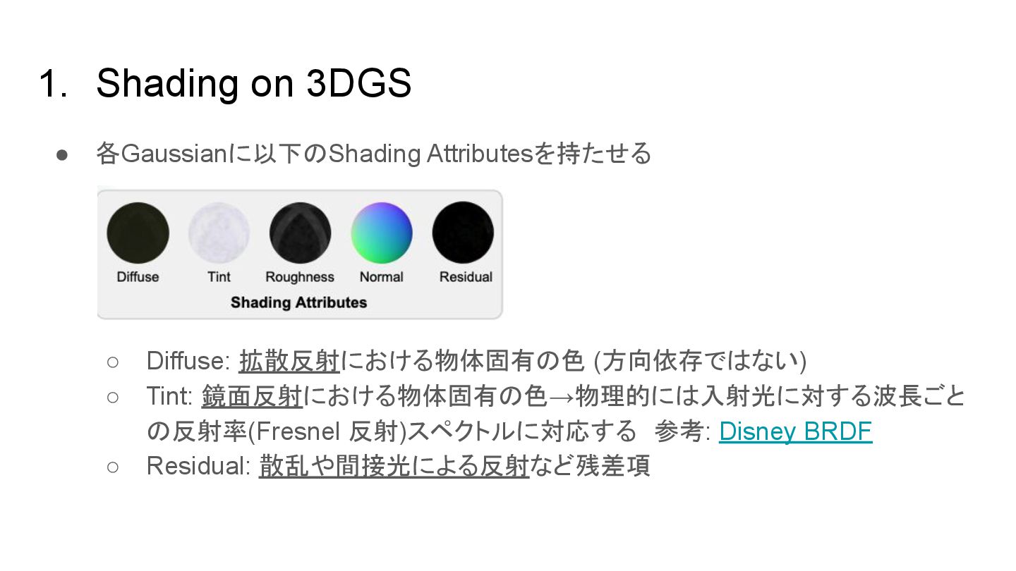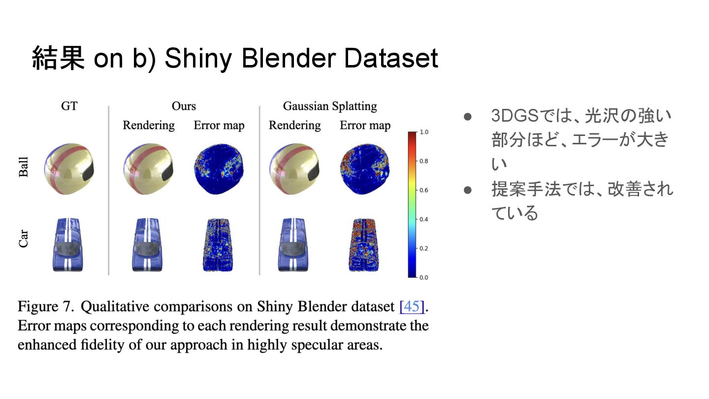 3D Gaussian Splatting(3DGS)において鏡面反射を表現するため、各Gaussianに法線や粗さなどのShading Attributesを付与し、環境光マップと組み合わせて学習を行った。この手法により、鏡面反射の強い物体を対象とした場合において、従来の3DGSよりも高精度な外観再現が可能となった。
