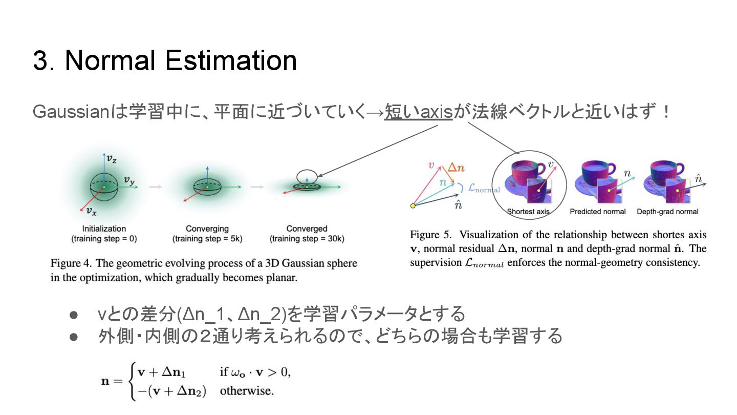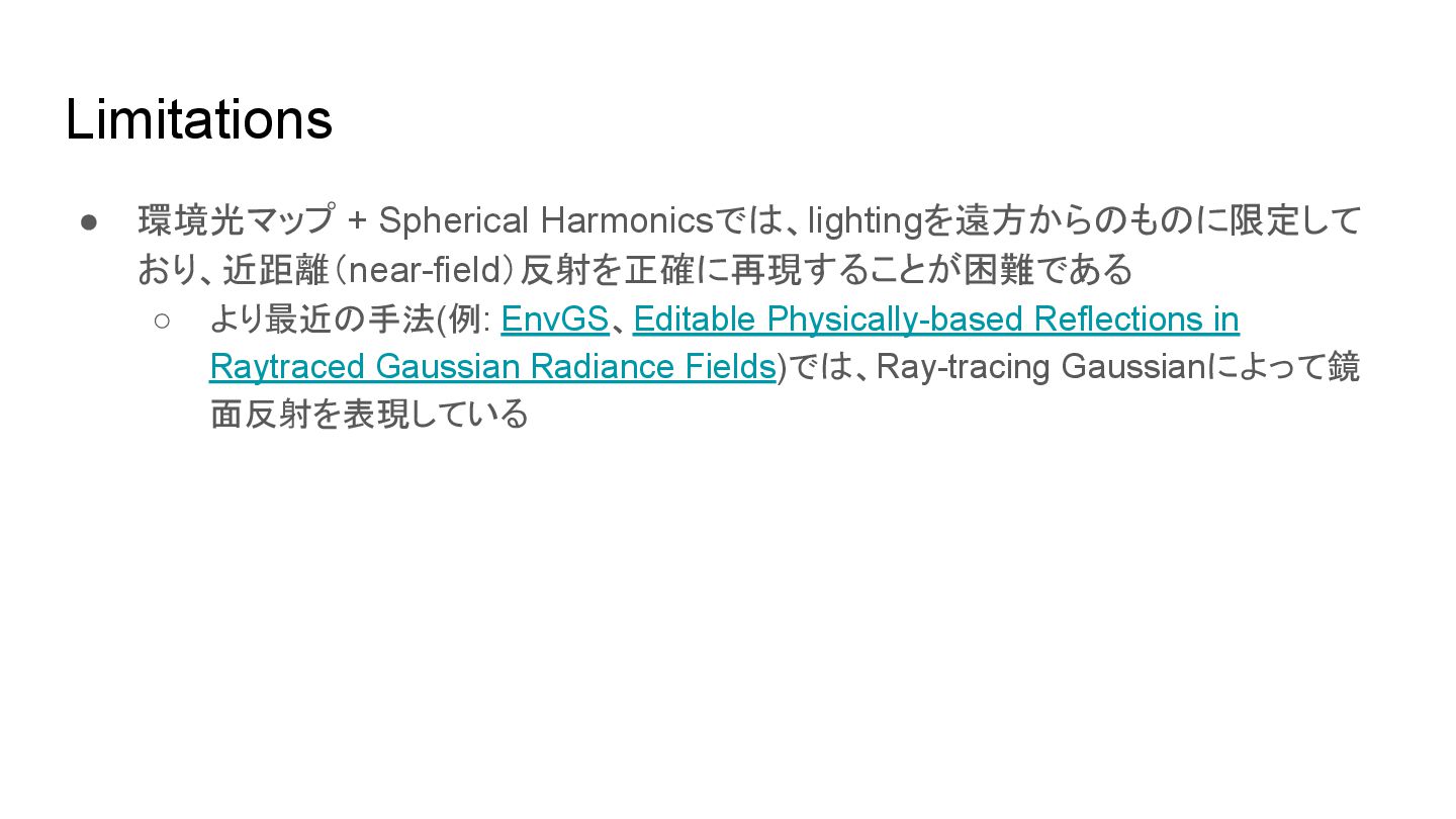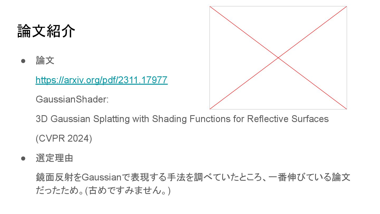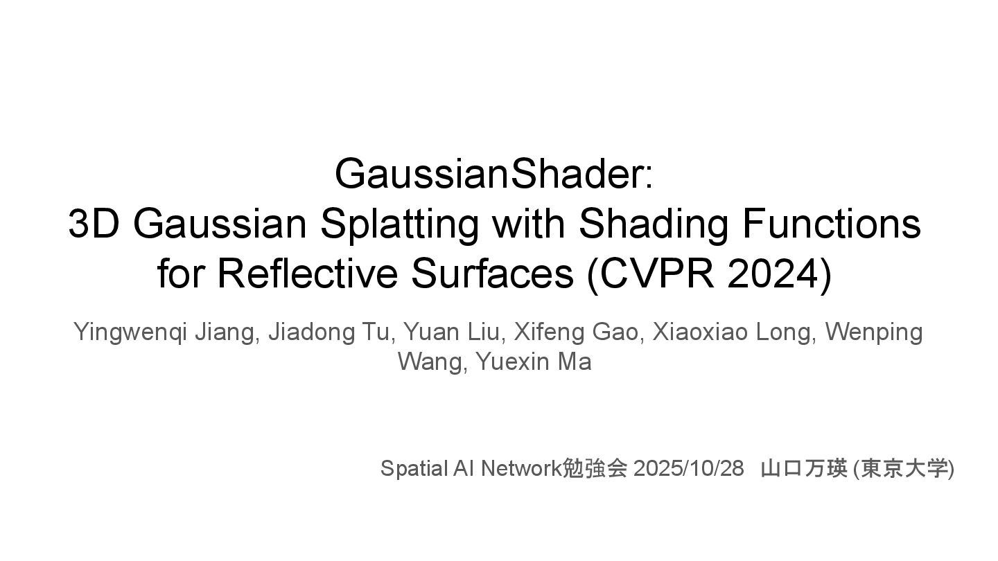3D Gaussian Splatting(3DGS)において鏡面反射を表現するため、各Gaussianに法線や粗さなどのShading Attributesを付与し、環境光マップと組み合わせて学習を行った。この手法により、鏡面反射の強い物体を対象とした場合において、従来の3DGSよりも高精度な外観再現が可能となった。