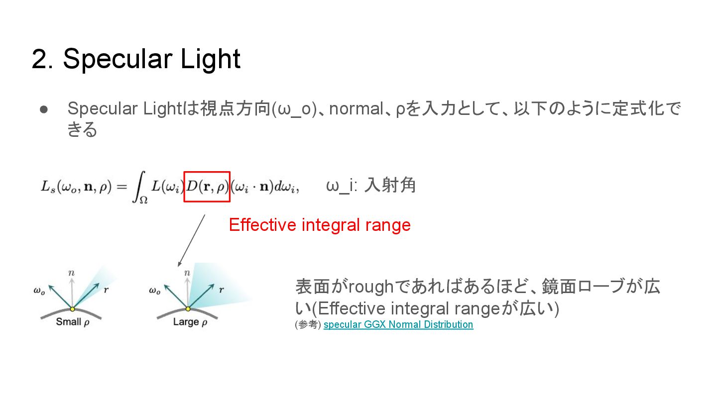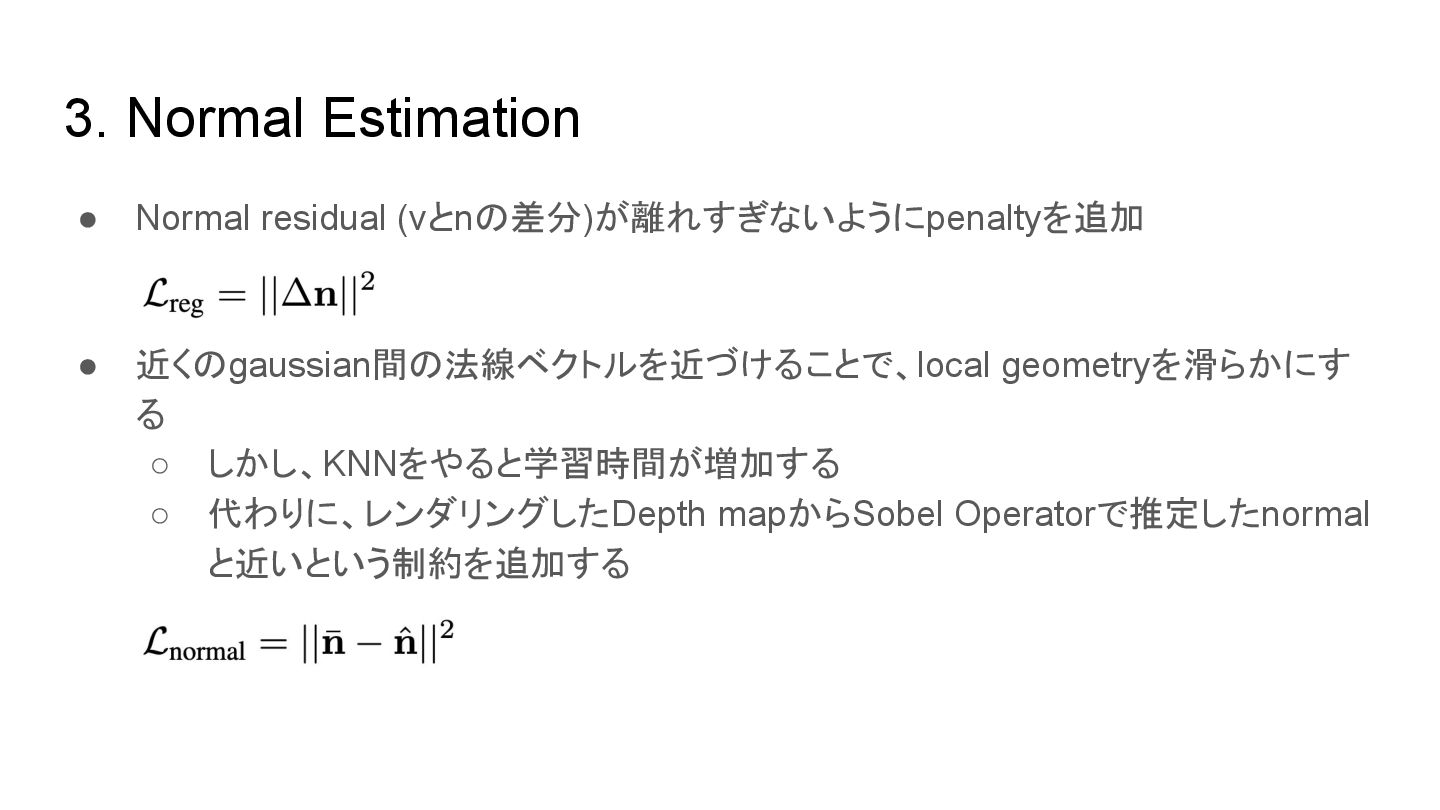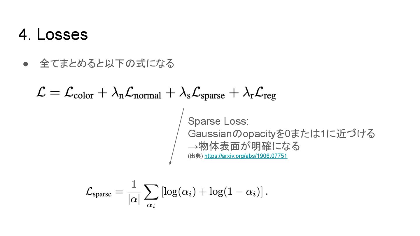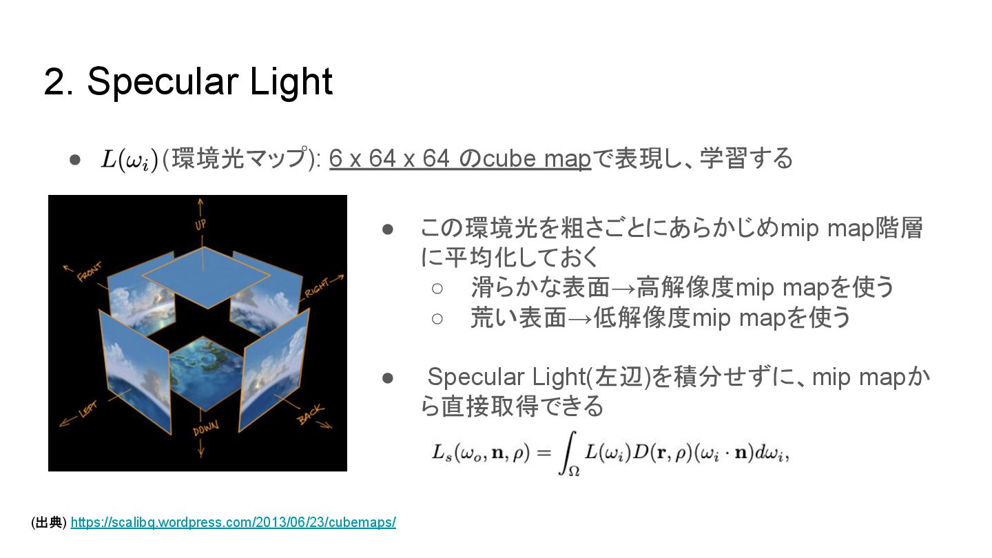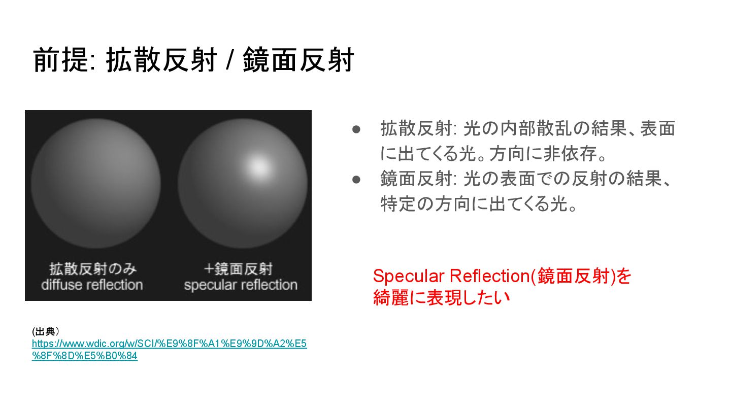 3D Gaussian Splatting(3DGS)において鏡面反射を表現するため、各Gaussianに法線や粗さなどのShading Attributesを付与し、環境光マップと組み合わせて学習を行った。この手法により、鏡面反射の強い物体を対象とした場合において、従来の3DGSよりも高精度な外観再現が可能となった。