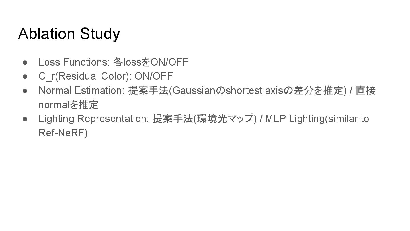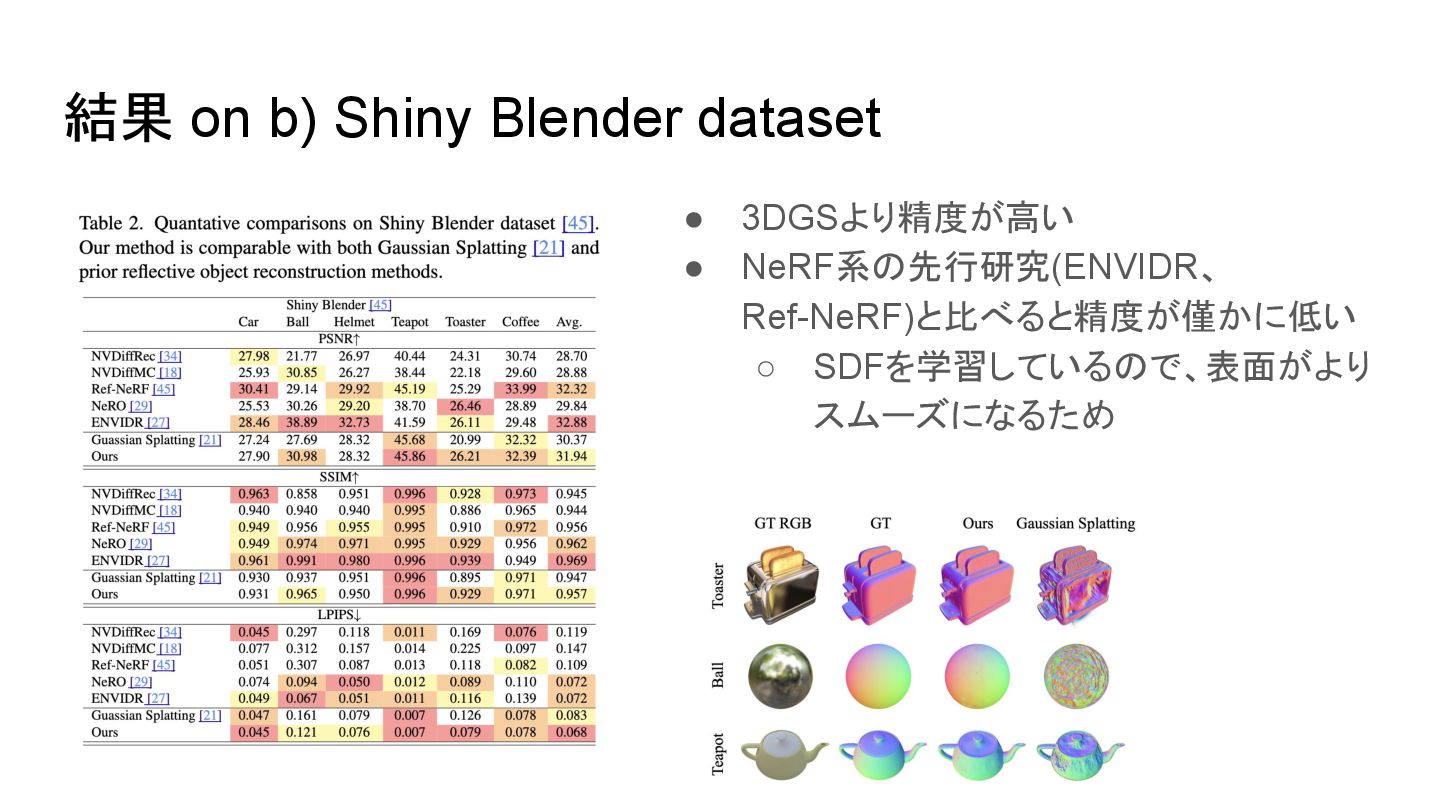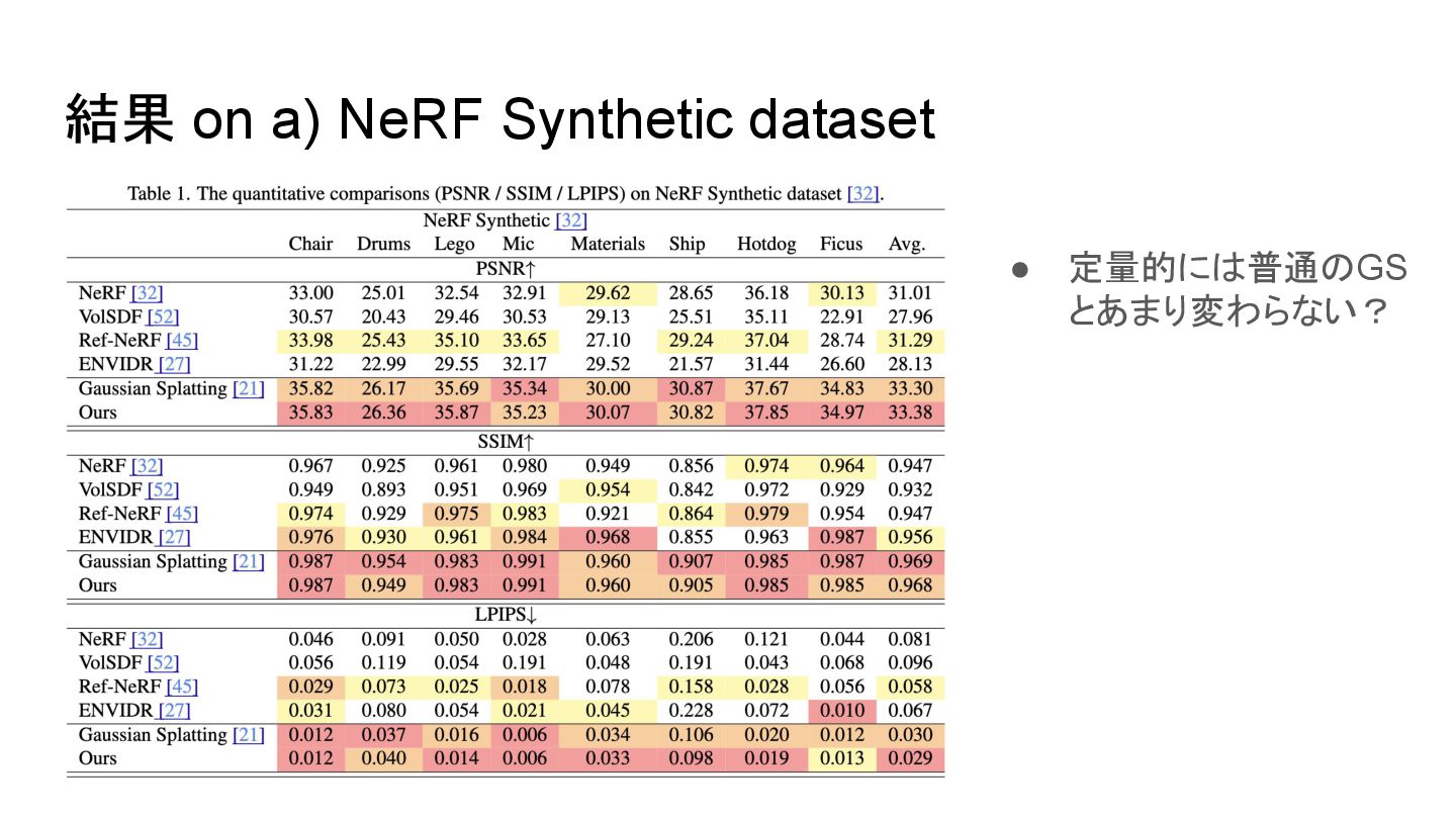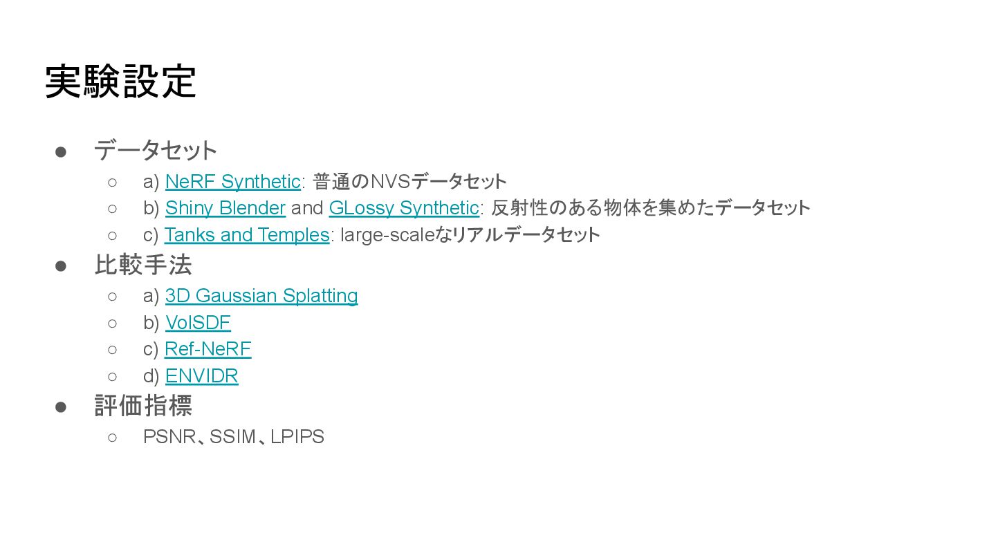 Shiny Blender and GLossy Synthetic: 反射性のある物体を集めたデータセット ◦ c) Tanks and Temples: large-scaleなリアルデータセット • 比較手法 ◦ a) 3D Gaussian Splatting ◦ b) VolSDF ◦ c) Ref-NeRF ◦ d) ENVIDR • 評価指標 ◦ PSNR、SSIM、LPIPS