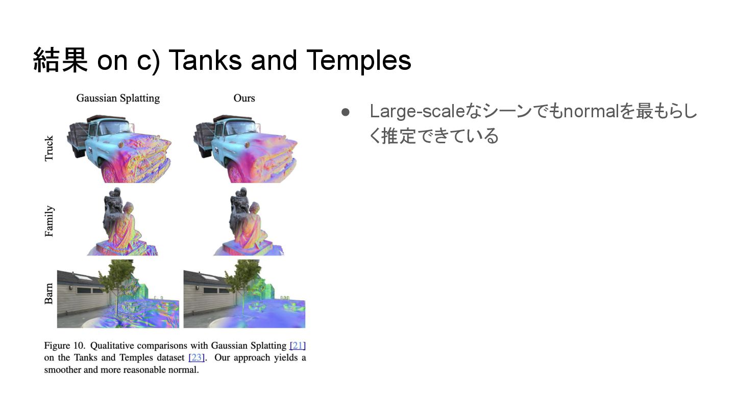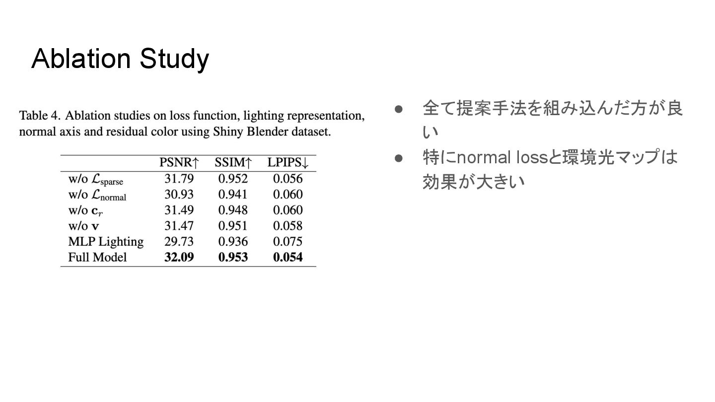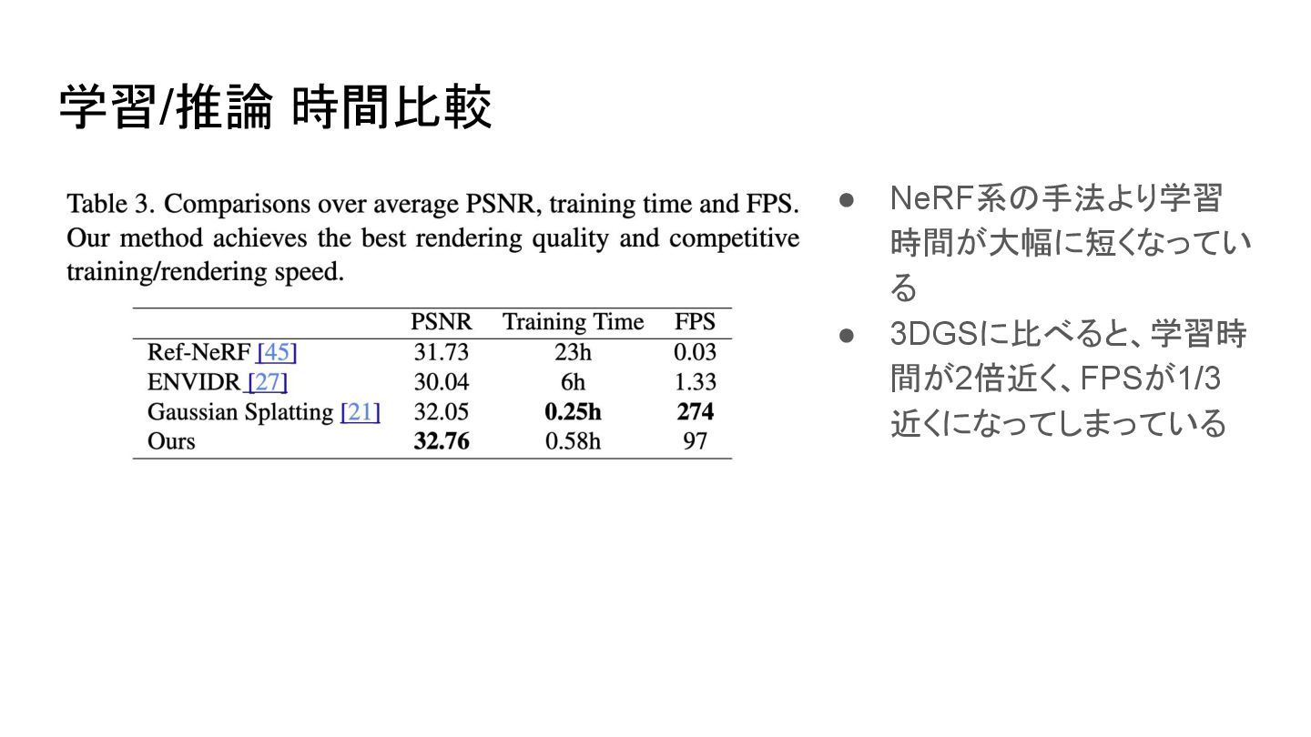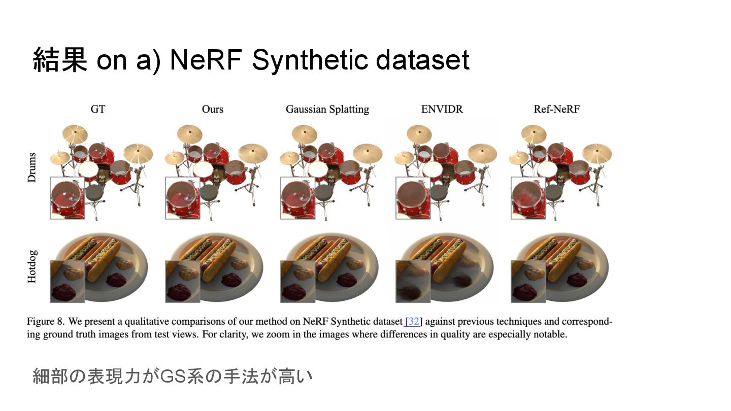 Shiny Blender and GLossy Synthetic: 反射性のある物体を集めたデータセット ◦ c) Tanks and Temples: large-scaleなリアルデータセット • 比較手法 ◦ a) 3D Gaussian Splatting ◦ b) VolSDF ◦ c) Ref-NeRF ◦ d) ENVIDR • 評価指標 ◦ PSNR、SSIM、LPIPS
