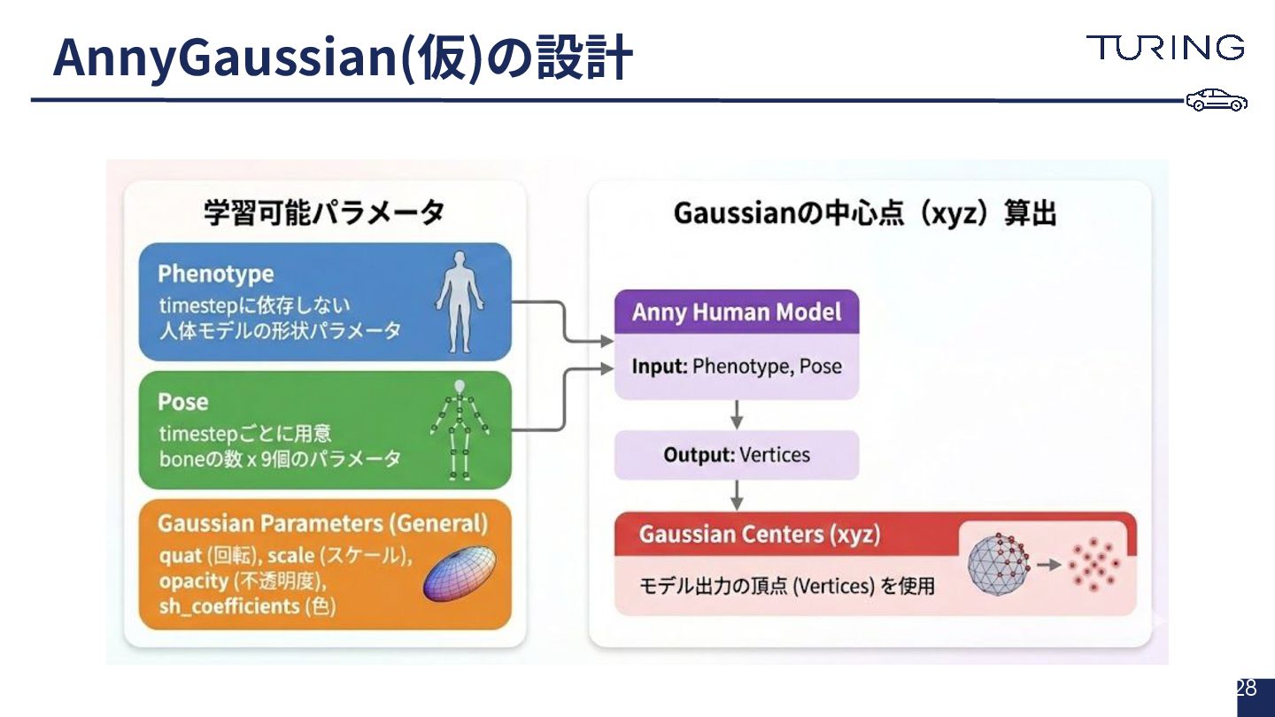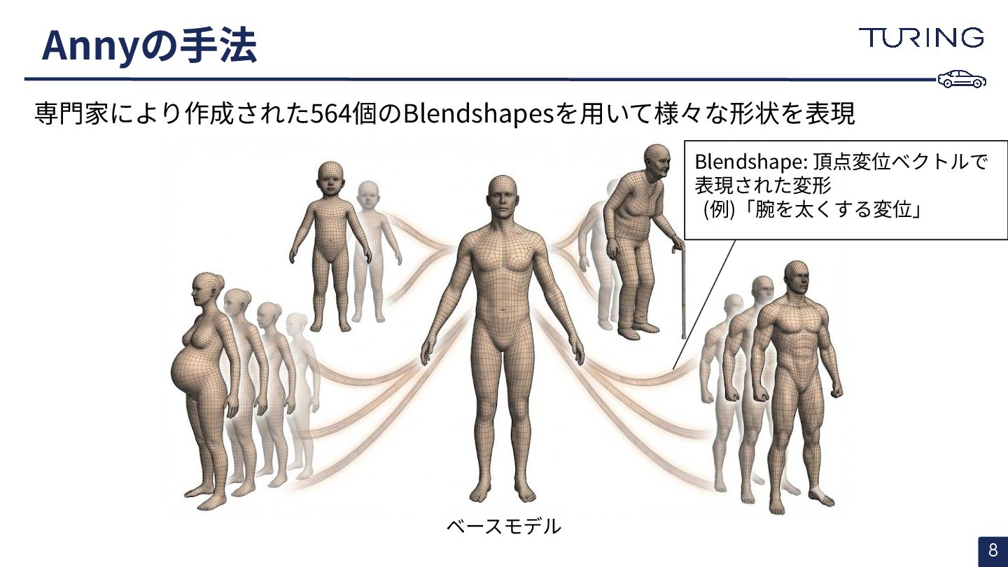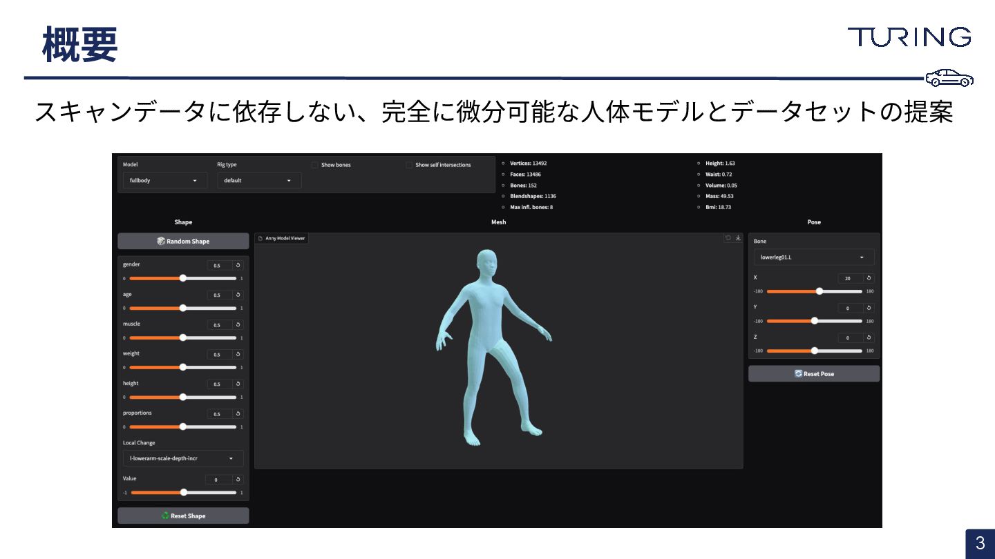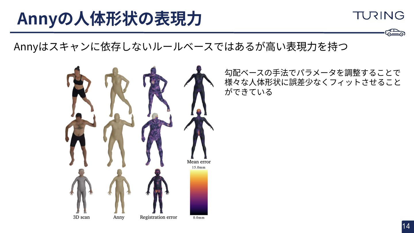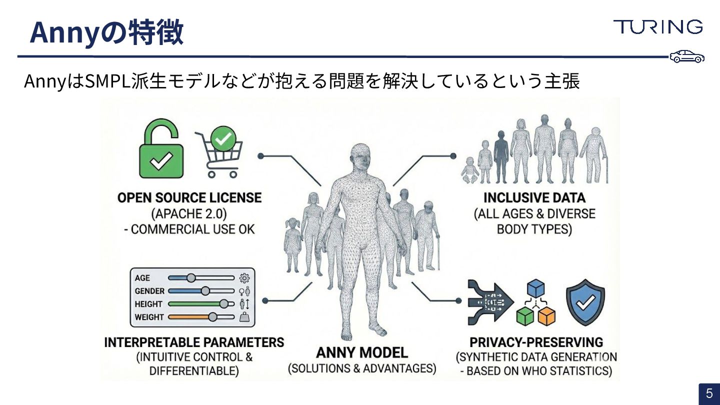 - 様々な人体形状に対応可能なスキャンフリーの人体メッシュモデルAnnyを提案 - スキャンに基づかない手法でありながらSMPLと同等以上の表現力を持ち、直感的なパラメータ操作で人体のモデリングが可能 - 微分可能なモデルとして実装されており、Apache 2.0ライセンスで公開されている - +αとして実際に3DGSと組み合わせた簡易的な実験を実施
