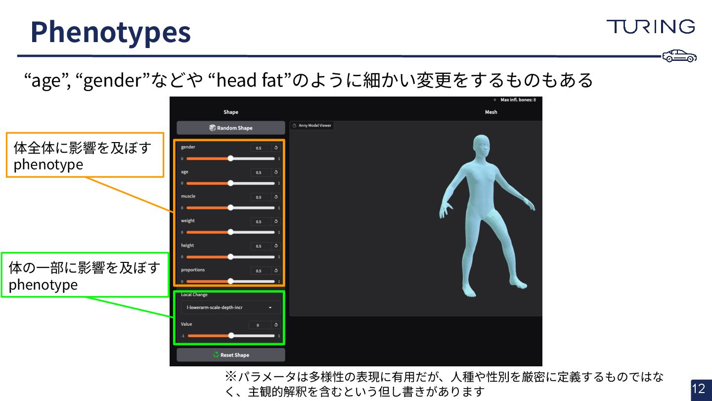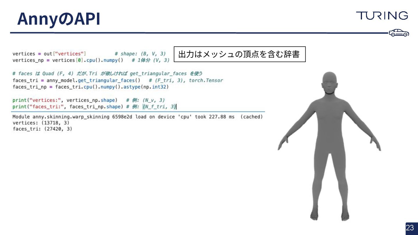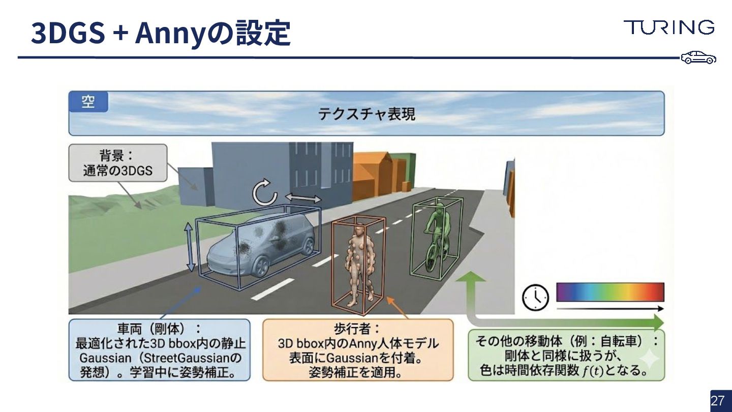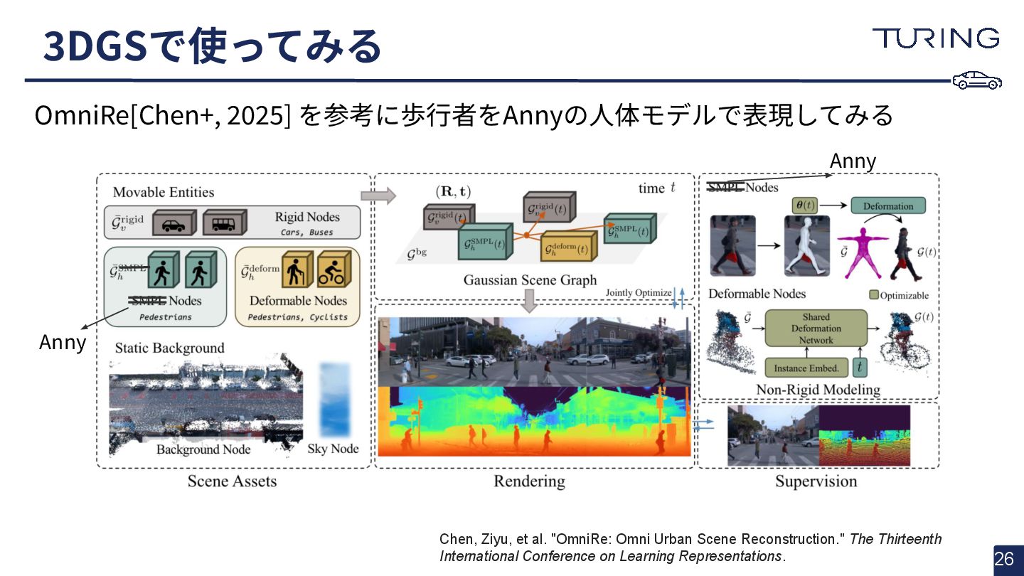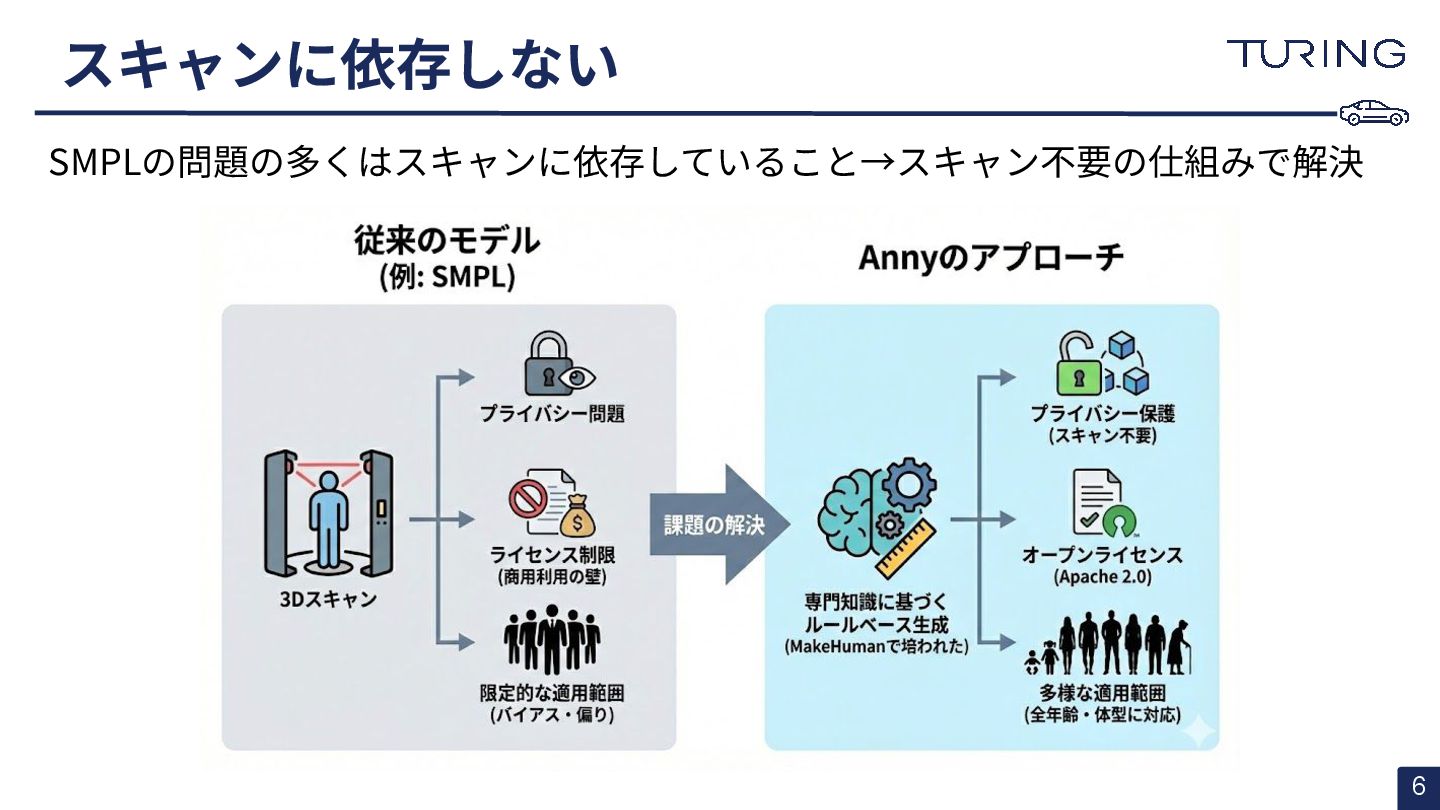 - 様々な人体形状に対応可能なスキャンフリーの人体メッシュモデルAnnyを提案 - スキャンに基づかない手法でありながらSMPLと同等以上の表現力を持ち、直感的なパラメータ操作で人体のモデリングが可能 - 微分可能なモデルとして実装されており、Apache 2.0ライセンスで公開されている - +αとして実際に3DGSと組み合わせた簡易的な実験を実施