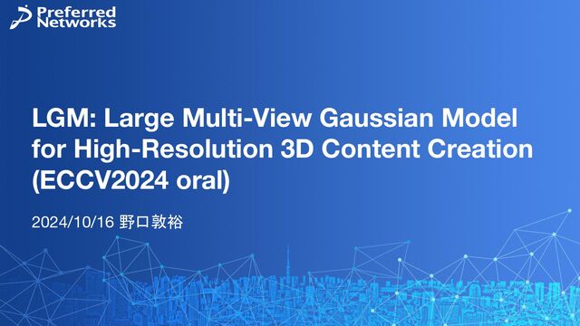 - 画像・テキストから3D Gaussian Splatting表現を生成する手法 - 複数視点の画像からGaussian Splattingのパラメータを直接推定するモデルを提案 - 既存の複数視点画像生成モデルと組みわせることで、高速かつ高精細な3DGS生成を実現