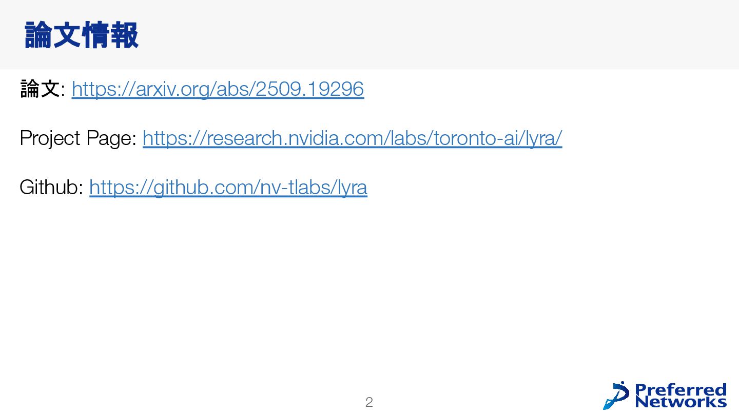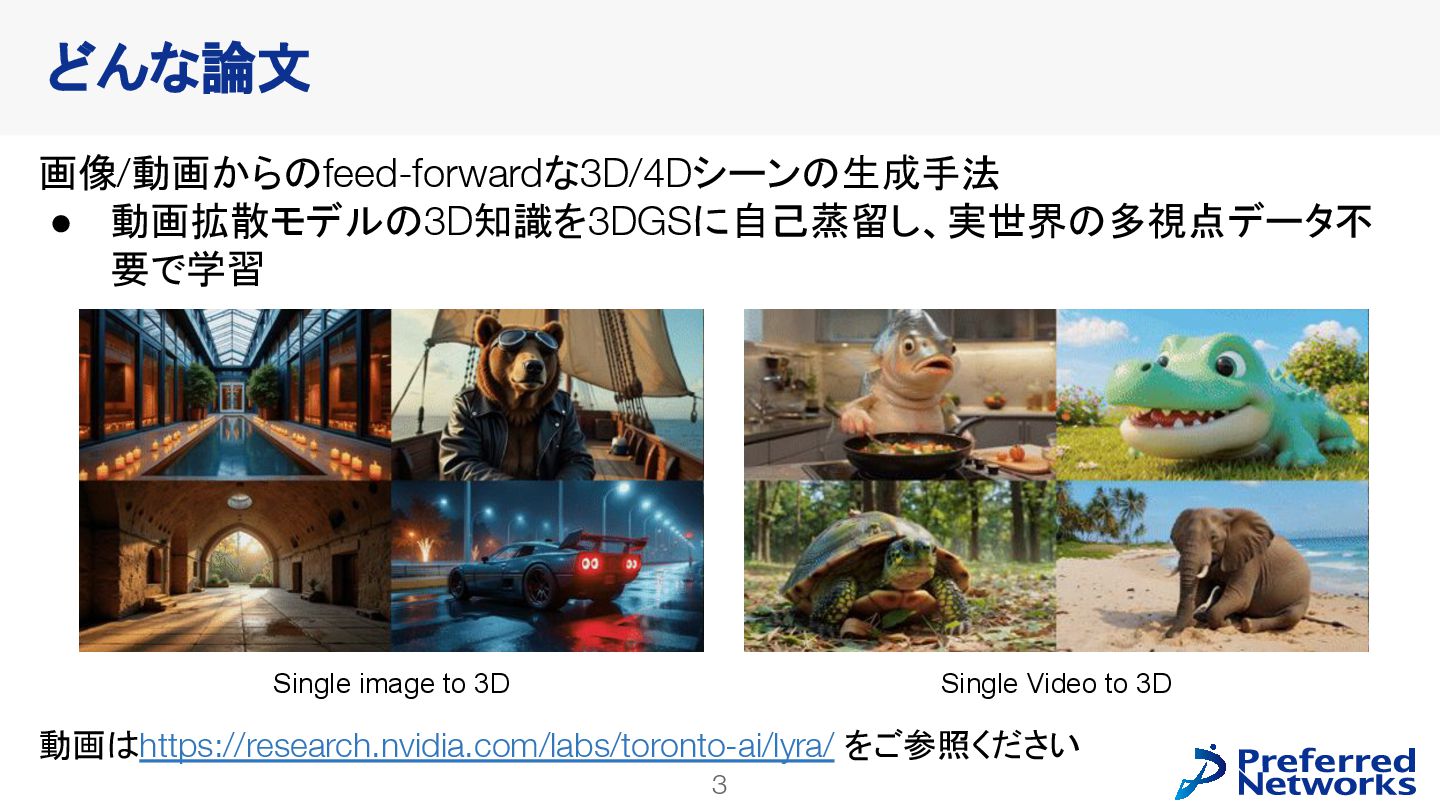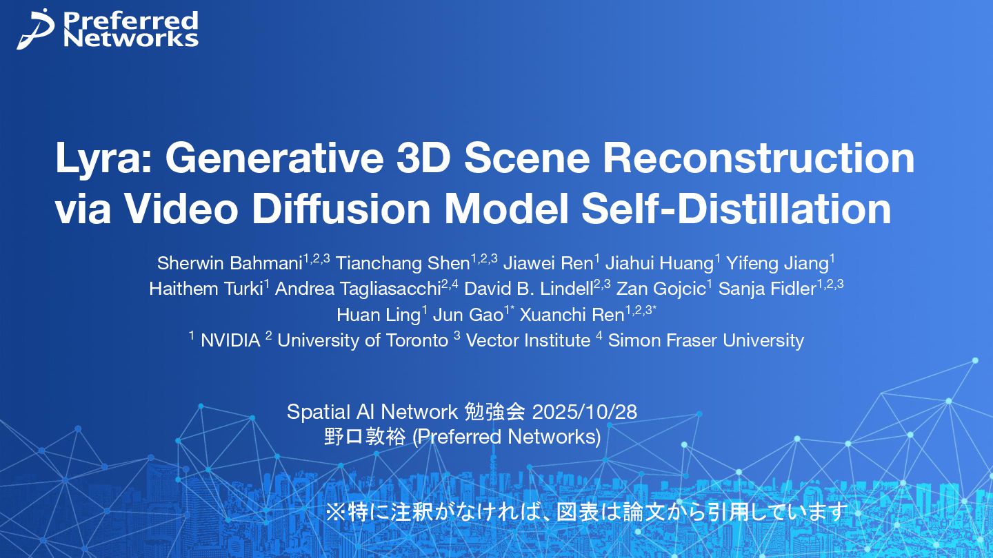 Sherwin Bahmani1,2,3 Tianchang Shen1,2,3 Jiawei Ren1 Jiahui Huang1 Yifeng Jiang1 Haithem Turki1 Andrea Tagliasacchi2,4 David B. Lindell2,3 Zan Gojcic1 Sanja Fidler1,2,3 Huan Ling1 Jun Gao1* Xuanchi Ren1,2,3* 1 NVIDIA 2 University of Toronto 3 Vector Institute 4 Simon Fraser University Spatial AI Network 勉強会 2025/10/28 野口敦裕 (Preferred Networks) ※特に注釈がなければ、図表は論文から引用しています