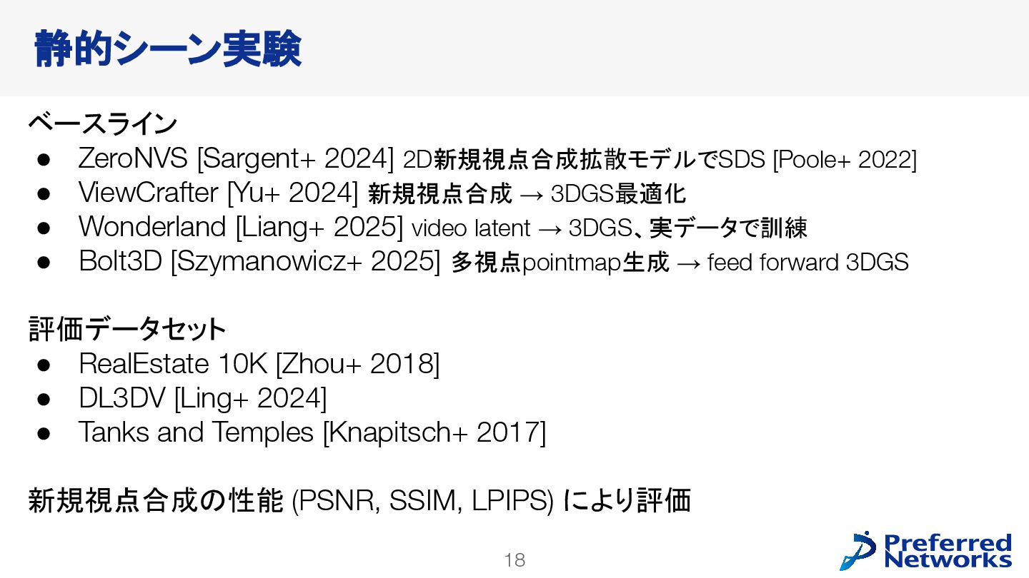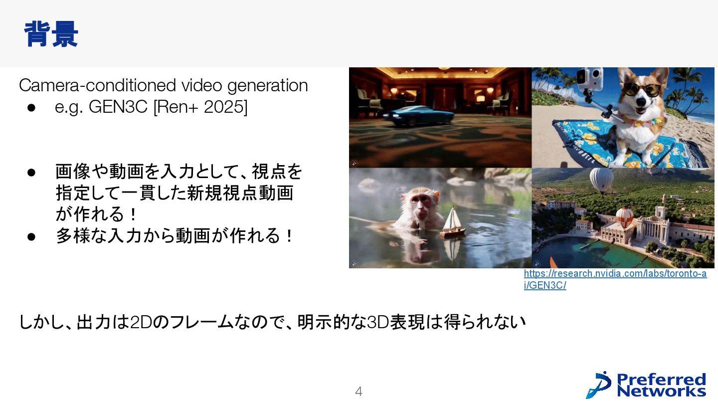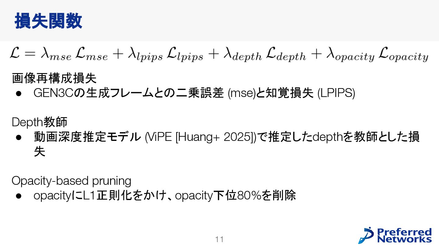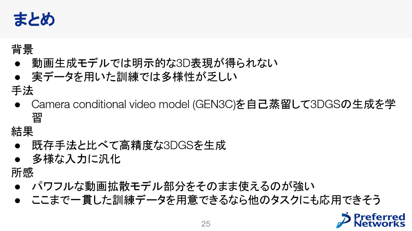 Sherwin Bahmani1,2,3 Tianchang Shen1,2,3 Jiawei Ren1 Jiahui Huang1 Yifeng Jiang1 Haithem Turki1 Andrea Tagliasacchi2,4 David B. Lindell2,3 Zan Gojcic1 Sanja Fidler1,2,3 Huan Ling1 Jun Gao1* Xuanchi Ren1,2,3* 1 NVIDIA 2 University of Toronto 3 Vector Institute 4 Simon Fraser University Spatial AI Network 勉強会 2025/10/28 野口敦裕 (Preferred Networks) ※特に注釈がなければ、図表は論文から引用しています
