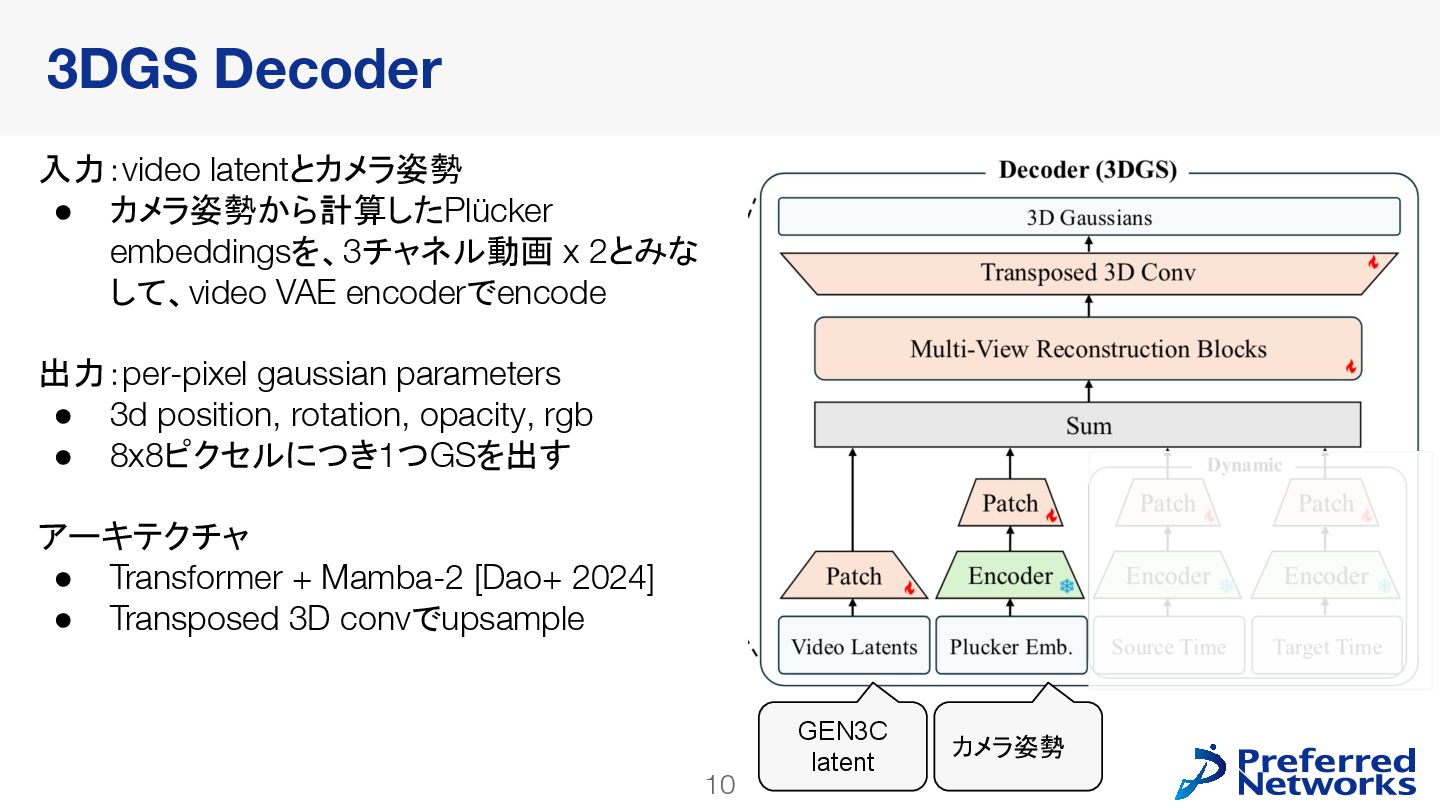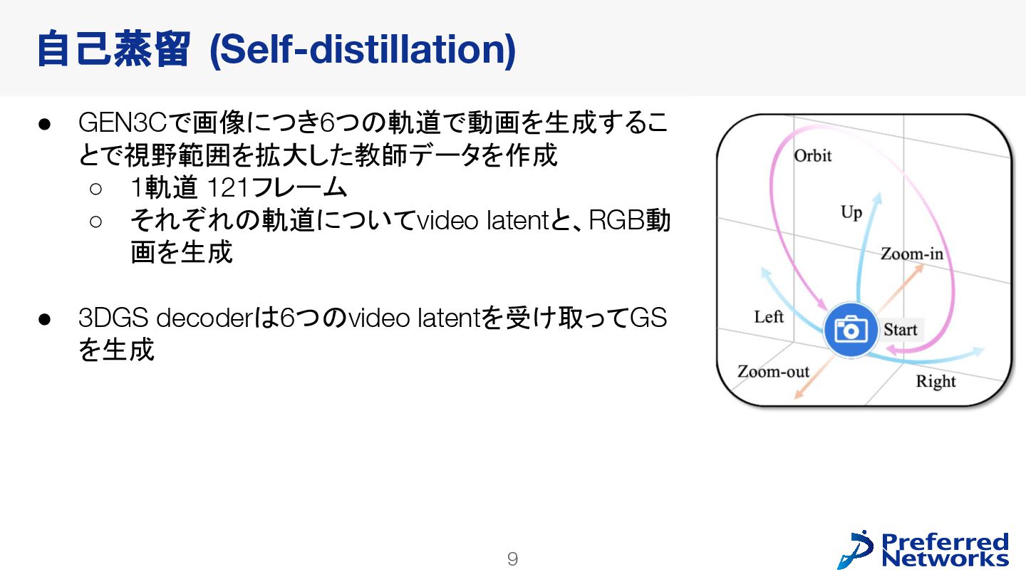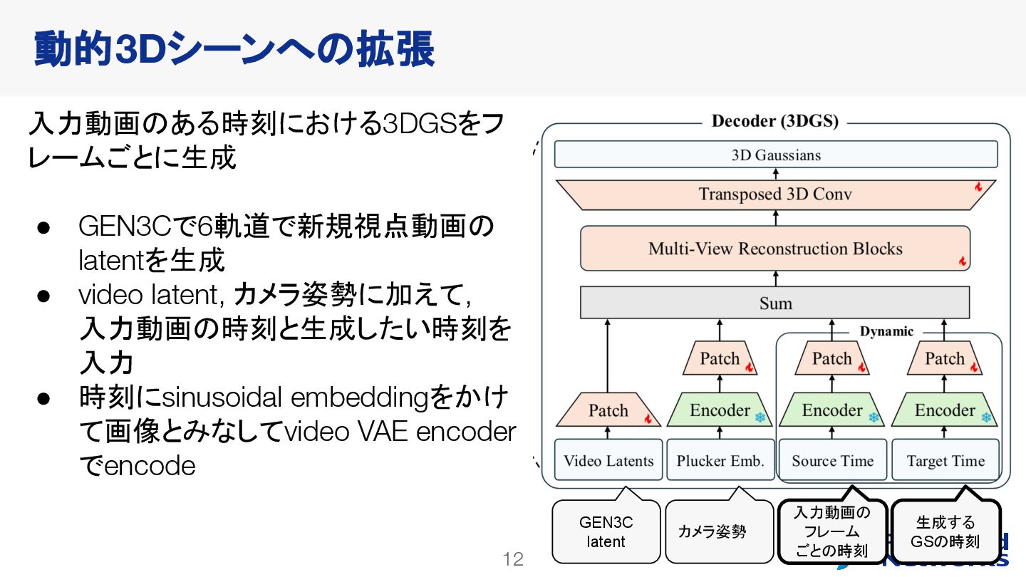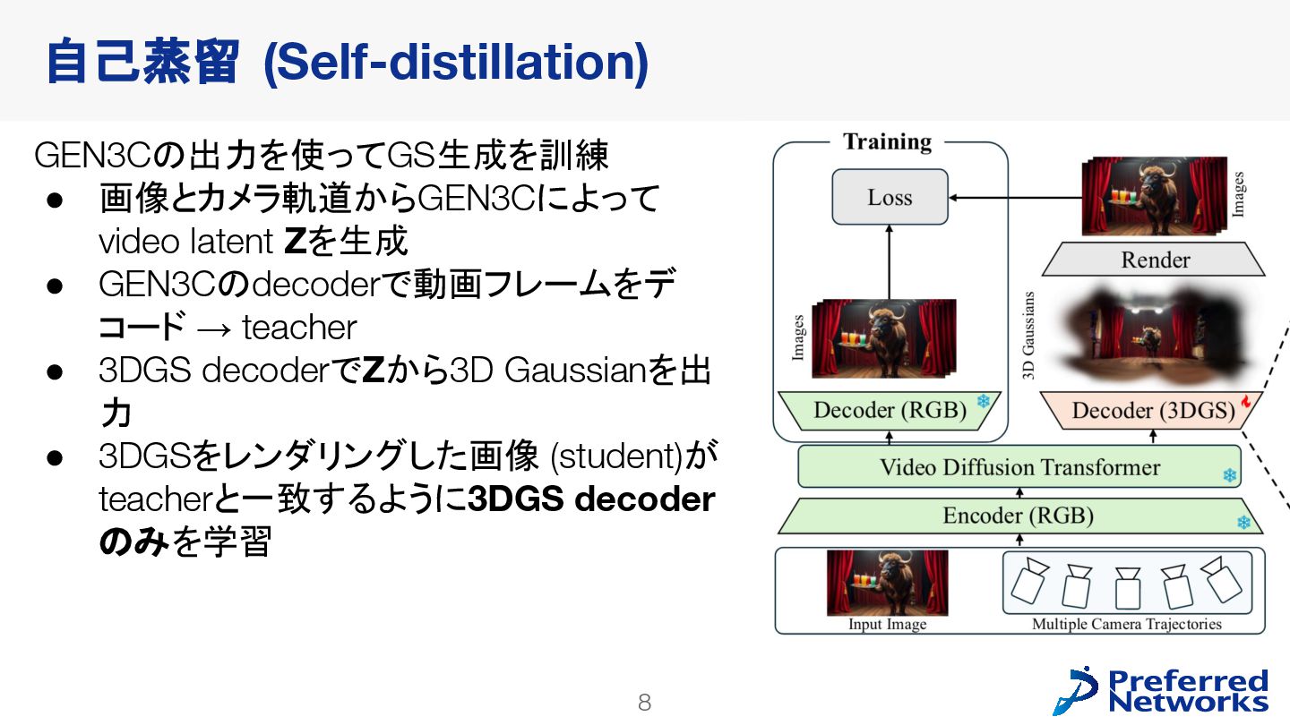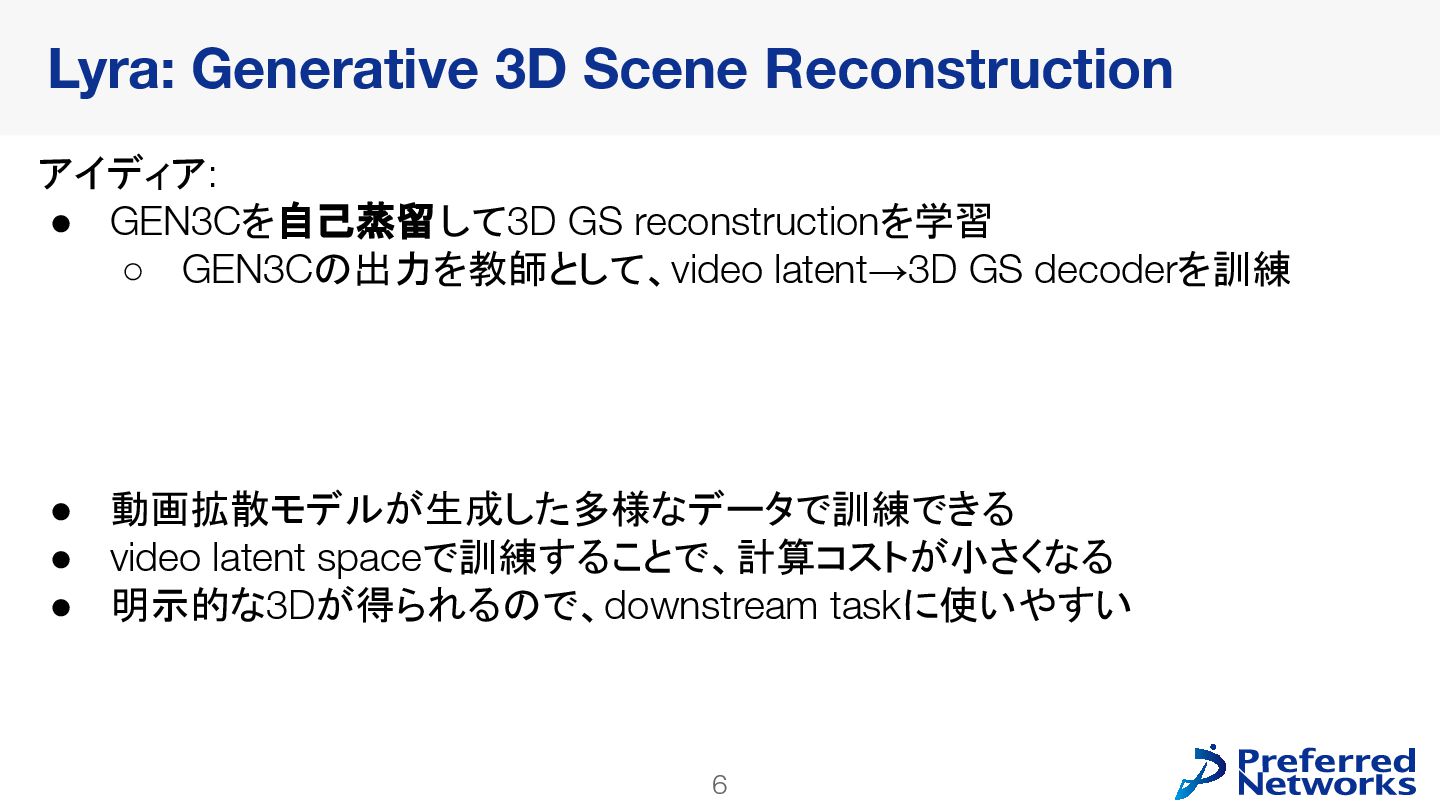 decoderを訓練 • 動画拡散モデルが生成した多様なデータで訓練できる • video latent spaceで訓練することで、計算コストが小さくなる • 明示的な3Dが得られるので、downstream taskに使いやすい Lyra: Generative 3D Scene Reconstruction