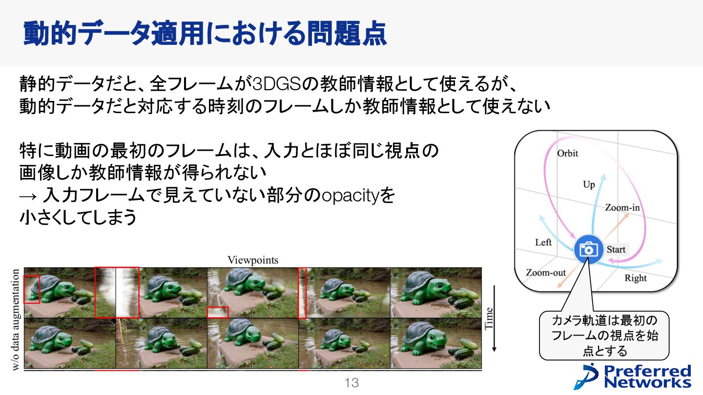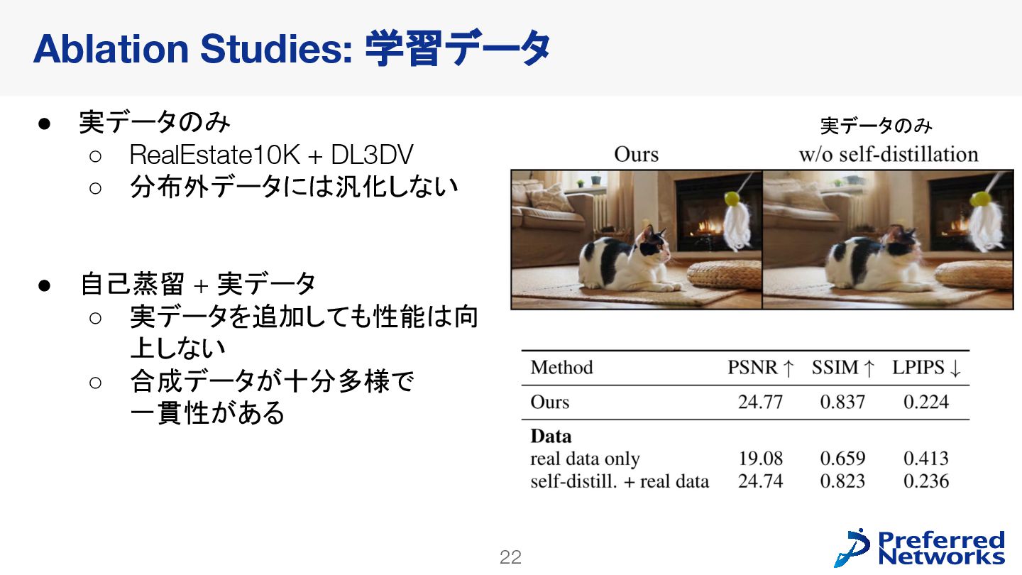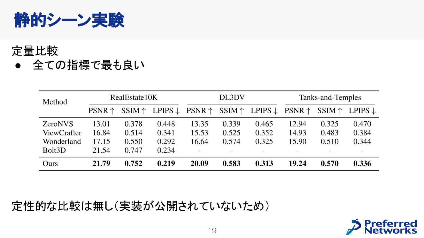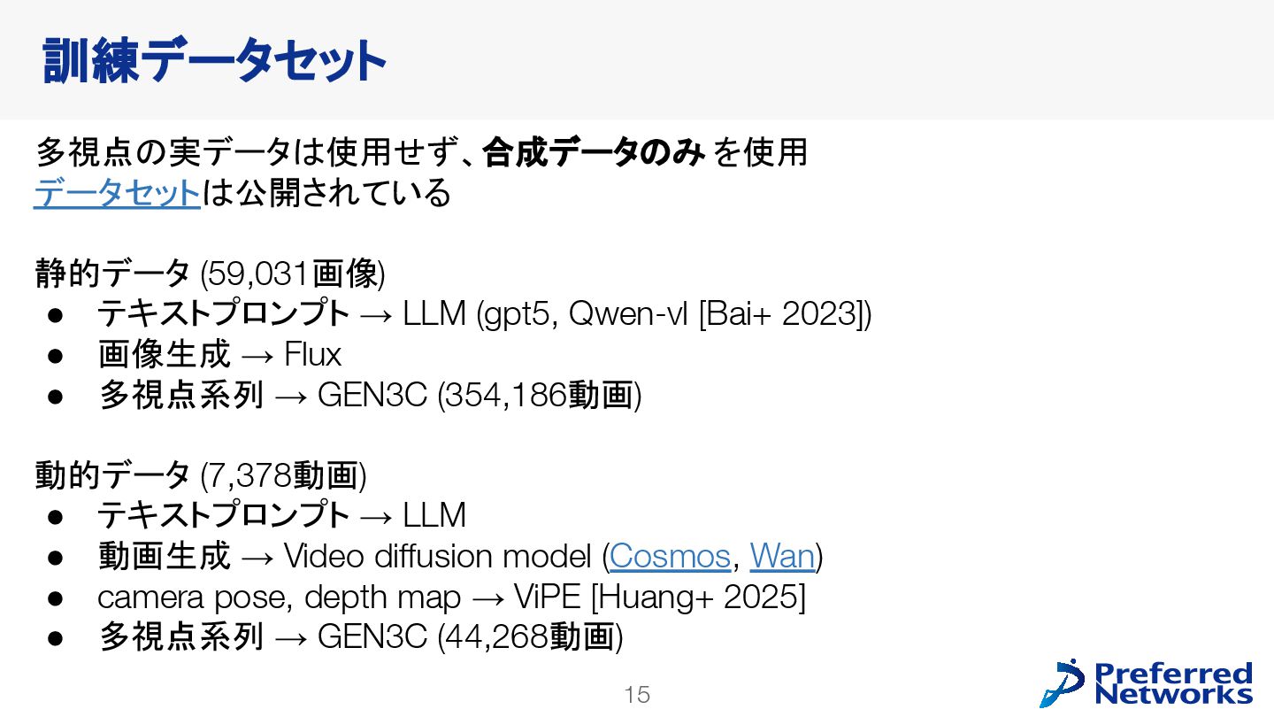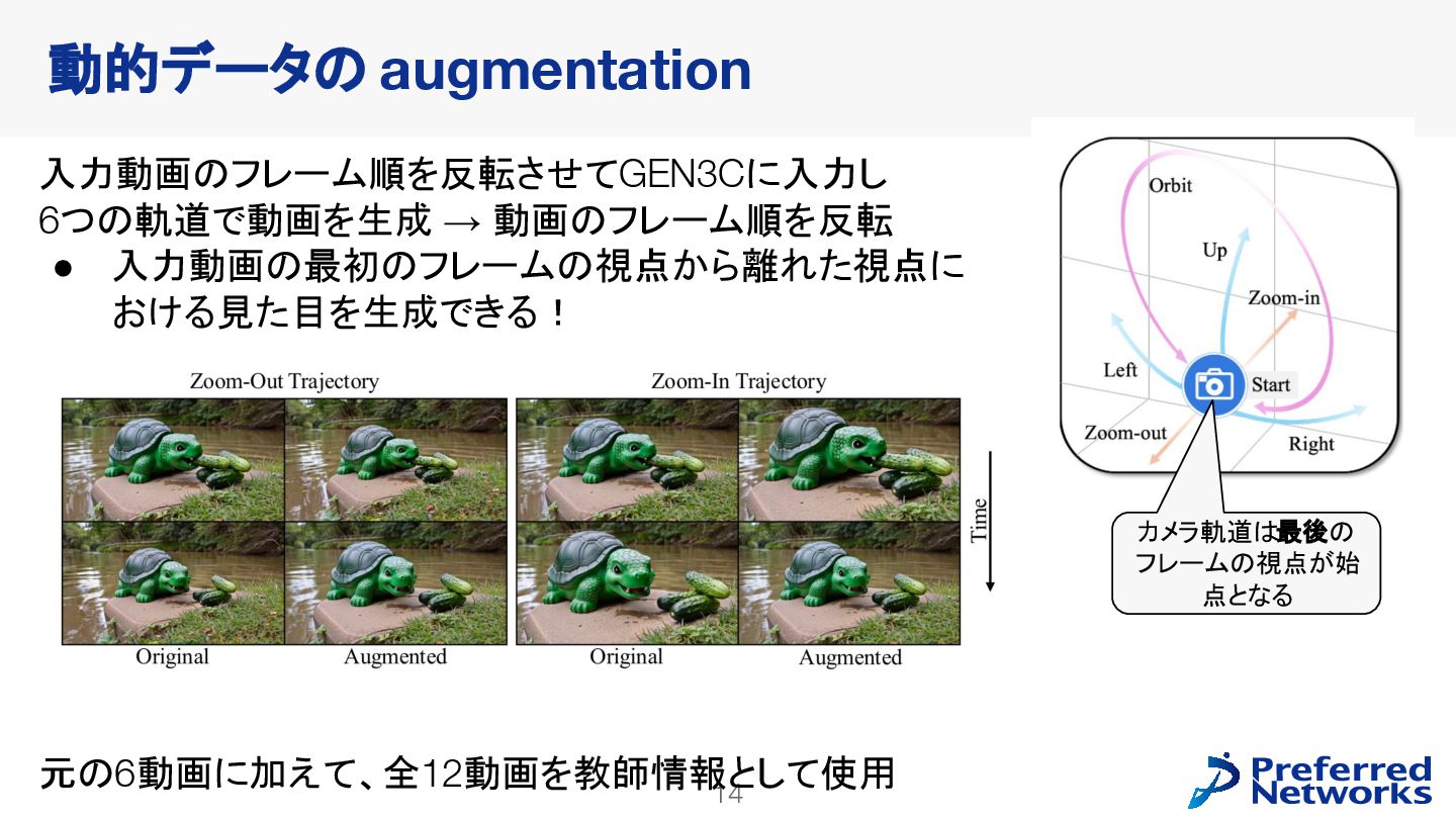 decoderを訓練 • 動画拡散モデルが生成した多様なデータで訓練できる • video latent spaceで訓練することで、計算コストが小さくなる • 明示的な3Dが得られるので、downstream taskに使いやすい Lyra: Generative 3D Scene Reconstruction