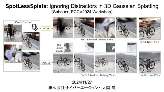 - 一時的に映る物体(動く人や風で飛ばされている物など)を効果的に無視する3DGS構築手法