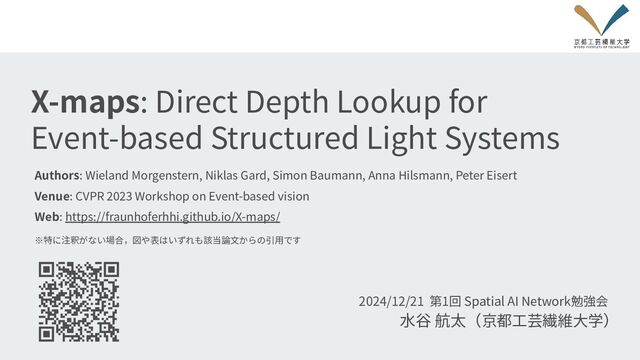 X-maps: Direct Depth Lookup for Event-based Structured Light Systems[Morgenstern+, CVPRW2023] (https://fraunhoferhhi.github.io/X-maps/) の論文紹介資料です.