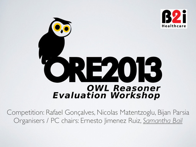My slides announcing the results of the ORE 2013 OWL reasoner competition. Note that I announced Konclude as the winner of the RL satisfiability challenge, but that was an error with the graphs which is now corrected - the actual winner was MORe (although Konclude did almost as well and was significantly faster).