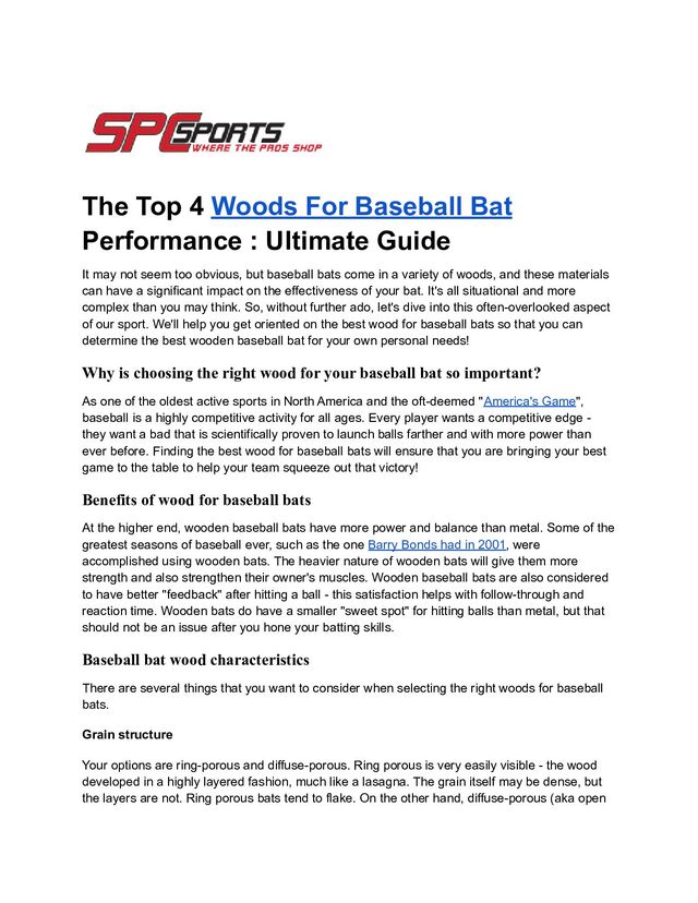 It may not seem too obvious, but baseball Slowpitch Softball Bats & Fastpitch Softball Bats come in a variety of woods, and these materials can have a significant impact on the effectiveness of your bat. It’s all situational and more complex than you may think. So, without further ado, let’s dive into this often-overlooked aspect of our sport. We’ll help you get oriented on the best wood for baseball bats so that you can determine the best wooden baseball bat for your own personal needs! To know more: https://www.spcsports.com/blog/the-top-4-woods-for-baseball-bat-performance-ultimate-guide/