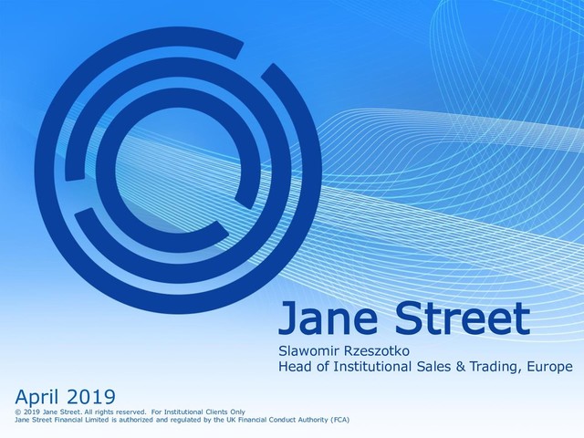reserved. Issued in the United States by Jane Street Execution Services, LLC (JSES), a U.S. registered broker‐dealer and member of FINRA (www.finra.org) and SIPC (www.SIPC.com), in Europe by Jane Street Financial Limited, a registered dealer authorized and regulated by the U.K. Financial Conduct Authority, and in Hong Kong by Jane Street Hong Kong Limited, a licensed company under the Hong Kong Securities and Futures Commission (CE No. BAL548). This material is provided for informational purposes only and is not for distribution to retail clients or where prohibited by applicable law or regulation. This material does not constitute an offer or solicitation for the purchase or sale of any security or other financial instrument. This presentation is for your information only and contains certain sensitive information concerning Jane Street. Accordingly, this presentation, and its contents, may not be provided or otherwise shared with any third‐party without the prior written consent of Jane Street. Disclaimers