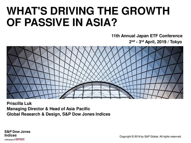 2019 by S&P Global. All rights reserved. Priscilla Luk Managing Director & Head of Asia Pacific Global Research & Design, S&P Dow Jones Indices 11th Annual Japan ETF Conference 2nd - 3rd April, 2019 / Tokyo