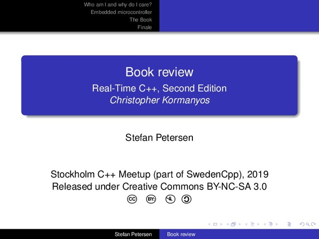 The Book Finale Book review Real-Time C++, Second Edition Christopher Kormanyos Stefan Petersen Stockholm C++ Meetup (part of SwedenCpp), 2019 Released under Creative Commons BY-NC-SA 3.0 CC BY: $ \ C Stefan Petersen Book review