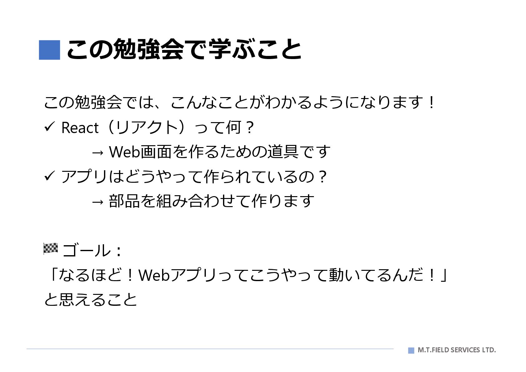 M.T.FIELD SERVICES LTD. この勉強会で学ぶこと この勉強会では、こんなことがわかるようになります︕ ü React(リアクト)って何︖ → Web画⾯を作るための道具です ü