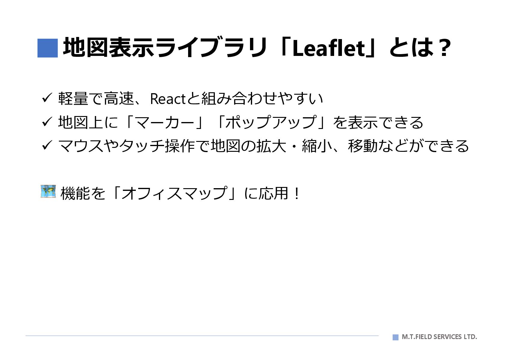 M.T.FIELD SERVICES LTD. 地図表⽰ライブラリ「Leaflet」とは︖ ü 軽量で⾼速、Reactと組み合わせやすい ü 地図上に「マーカー」「ポップアップ」を表⽰できる ü マウスやタッチ操作で地図の拡⼤・縮⼩、移動などができる