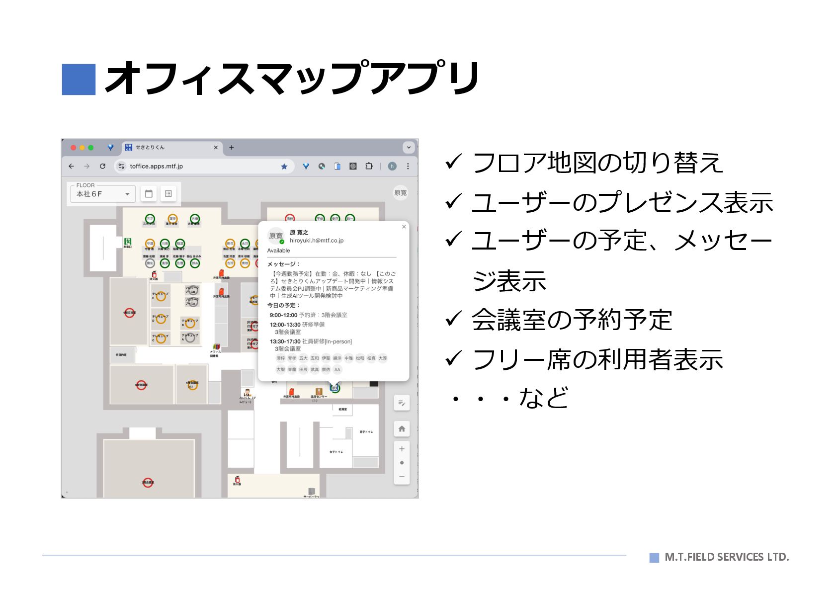 M.T.FIELD SERVICES LTD. オフィスマップアプリ ü フロア地図の切り替え ü ユーザーのプレゼンス表⽰ ü ユーザーの予定、メッセー