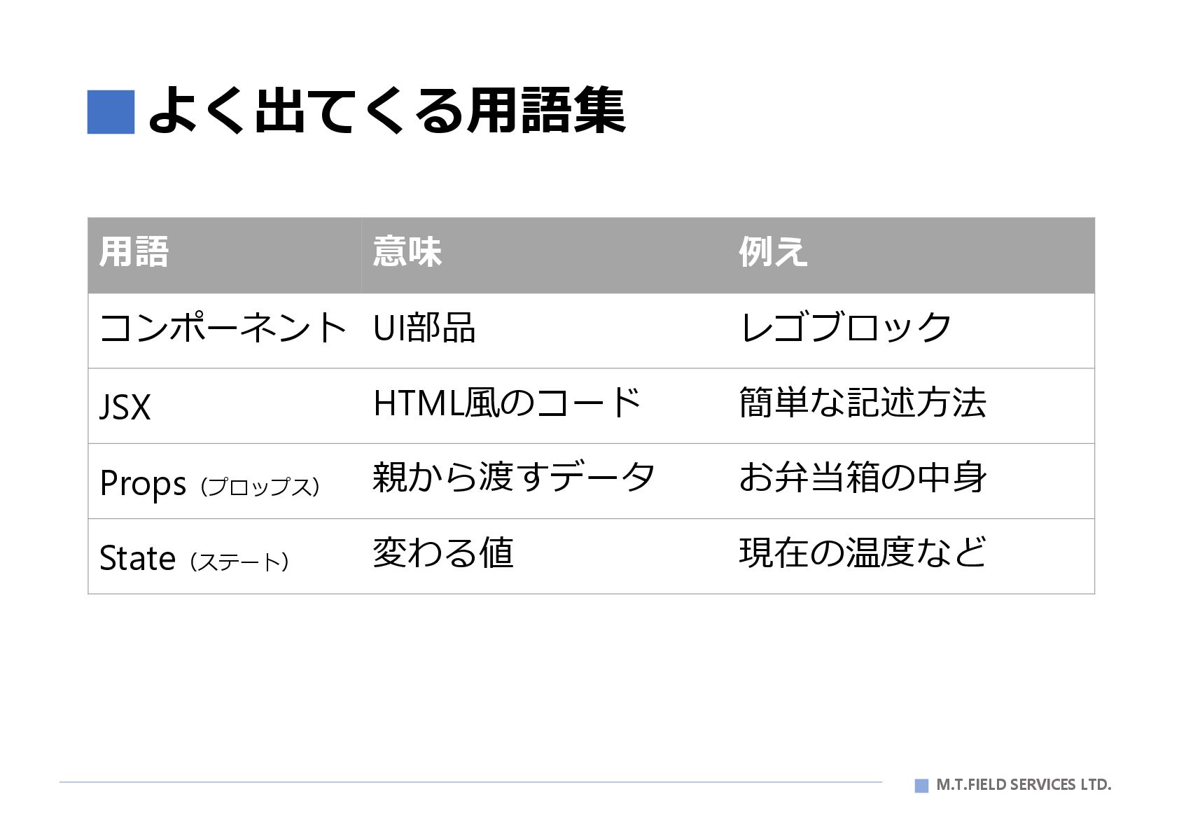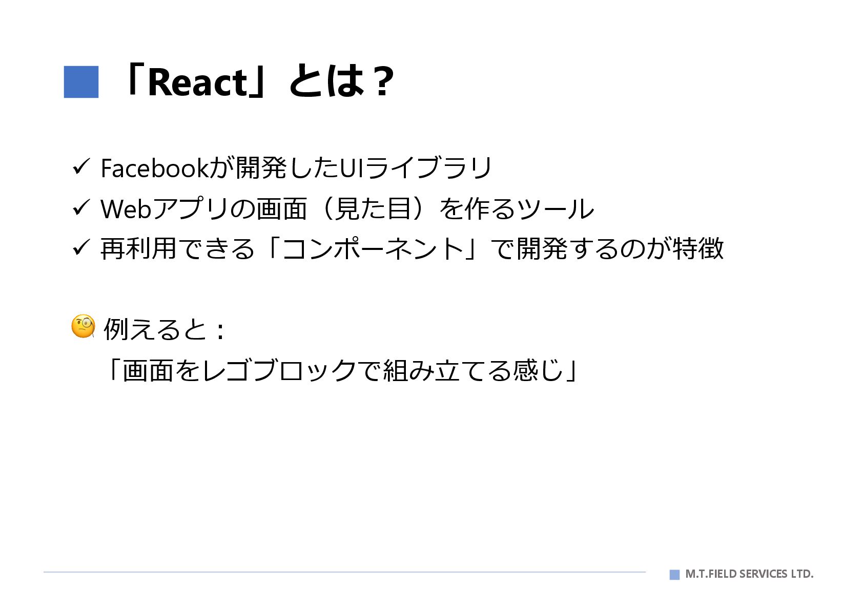 M.T.FIELD SERVICES LTD. 「React」とは︖ ü Facebookが開発したUIライブラリ ü Webアプリの画⾯(⾒た⽬)を作るツール ü 再利⽤できる「コンポーネント」で開発するのが特徴