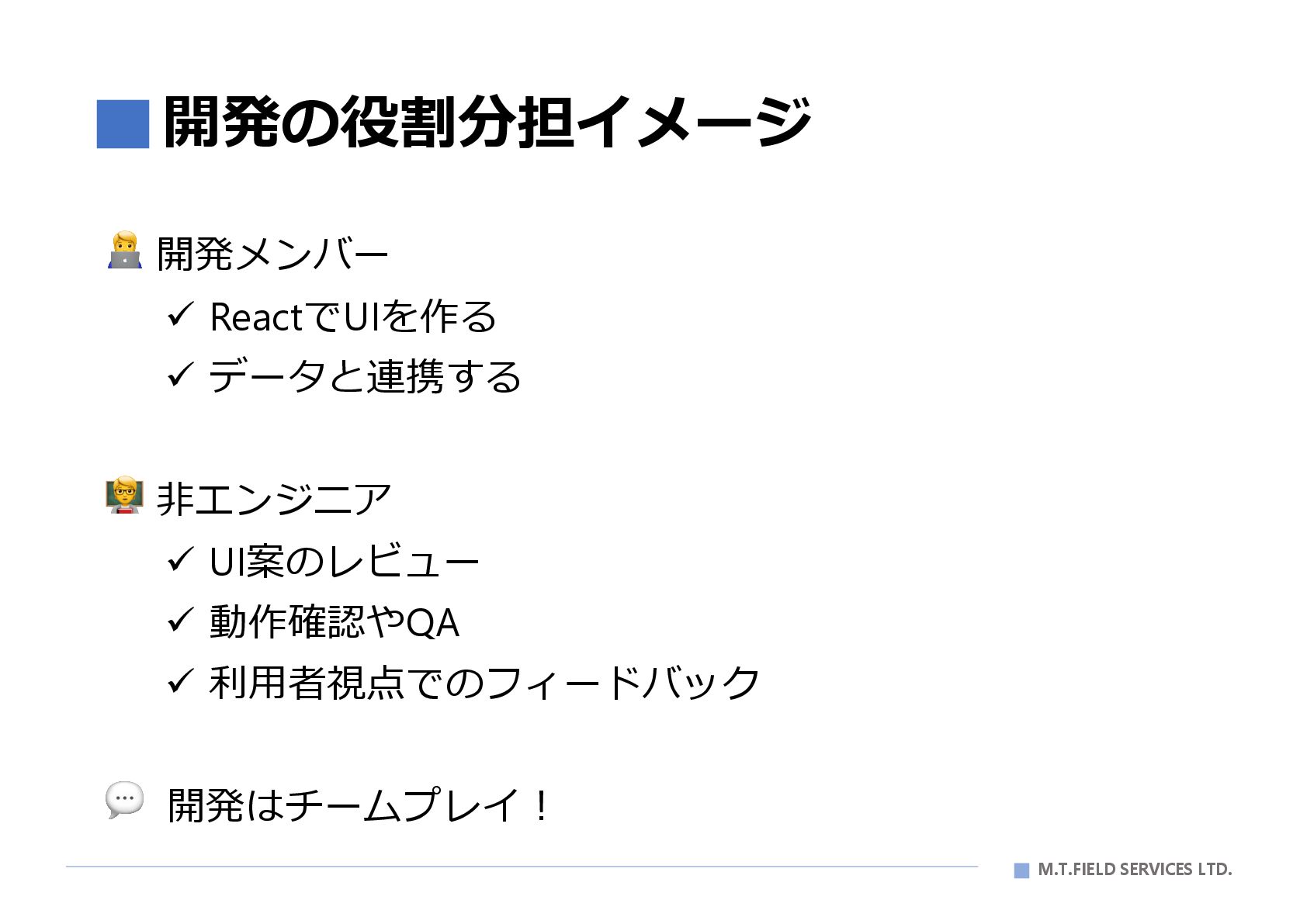 M.T.FIELD SERVICES LTD. 開発の役割分担イメージ 🧑💻 開発メンバー ü ReactでUIを作る ü データと連携する