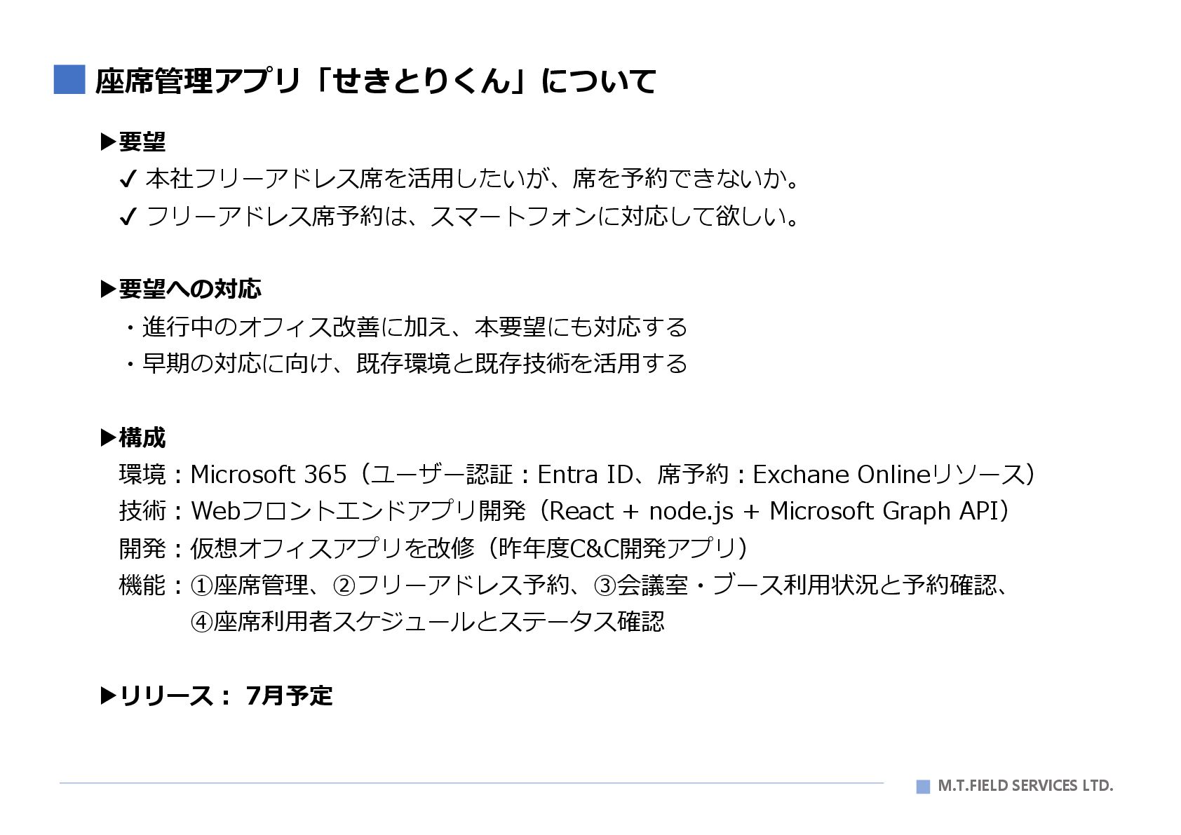 ・早期の対応に向け、既存環境と既存技術を活⽤する ▶構成 環境︓Microsoft 365(ユーザー認証︓Entra ID、席予約︓Exchane Onlineリソース) 技術︓Webフロントエンドアプリ開発(React + node.js + Microsoft Graph API) 開発︓仮想オフィスアプリを改修(昨年度C&C開発アプリ) 機能︓①座席管理、②フリーアドレス予約、③会議室・ブース利⽤状況と予約確認、 ④座席利⽤者スケジュールとステータス確認 ▶リリース︓ 7⽉予定 座席管理アプリ「せきとりくん」について