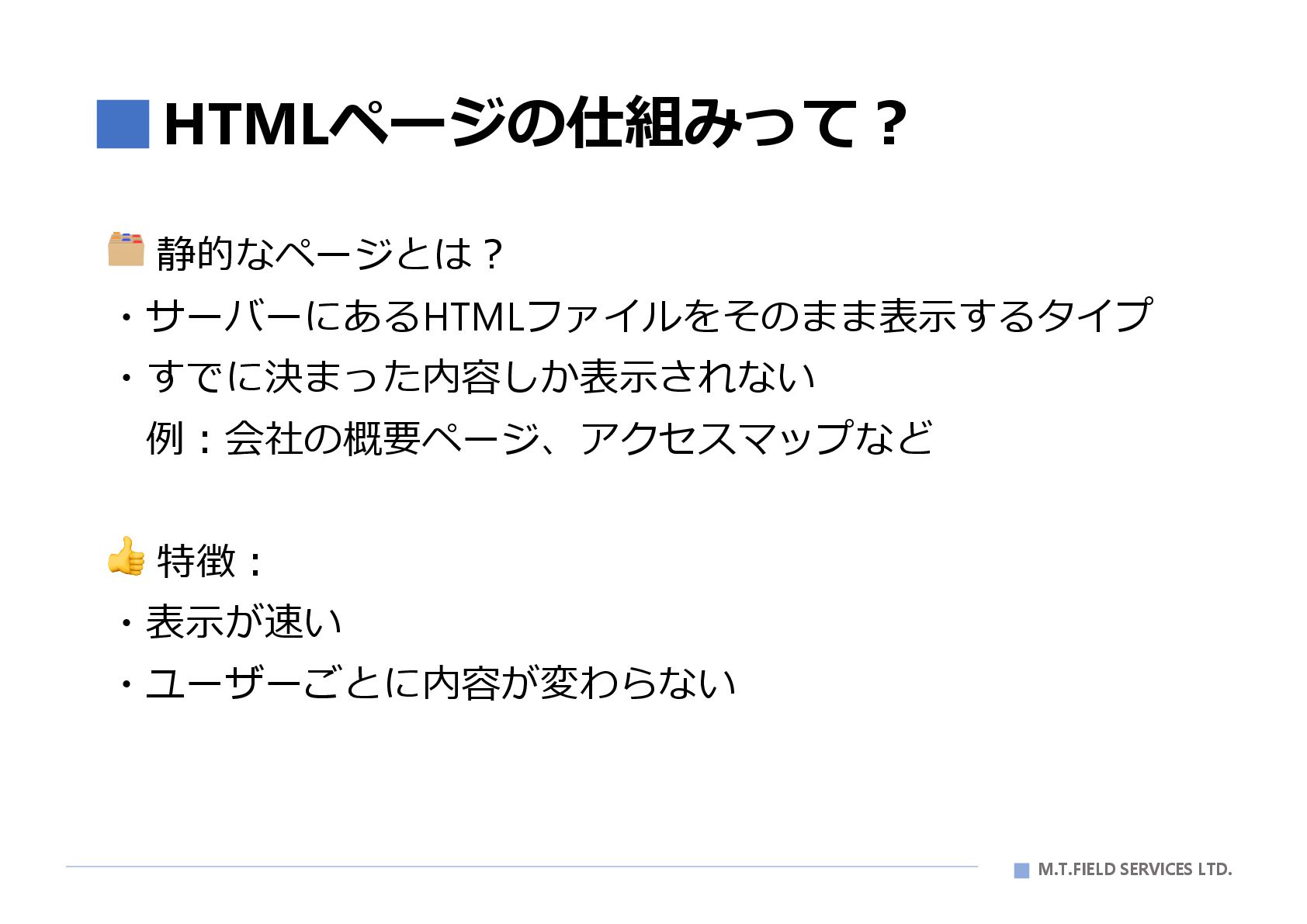 M.T.FIELD SERVICES LTD. HTMLページの仕組みって︖ 🗂 静的なページとは︖ ・サーバーにあるHTMLファイルをそのまま表⽰するタイプ ・すでに決まった内容しか表⽰されない 例︓会社の概要ページ、アクセスマップなど 👍
