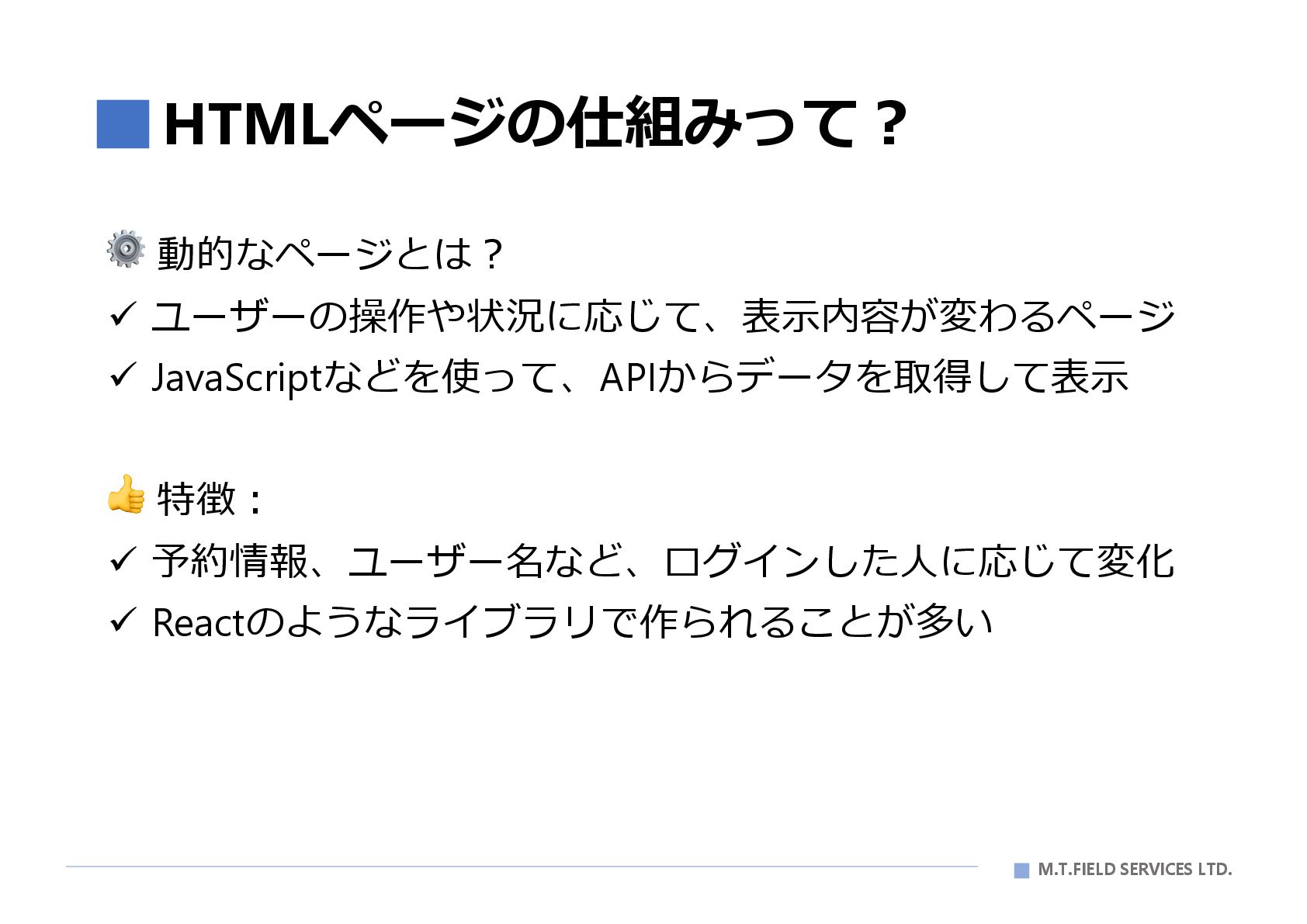 M.T.FIELD SERVICES LTD. HTMLページの仕組みって︖ ⚙ 動的なページとは︖ ü ユーザーの操作や状況に応じて、表⽰内容が変わるページ ü JavaScriptなどを使って、APIからデータを取得して表⽰