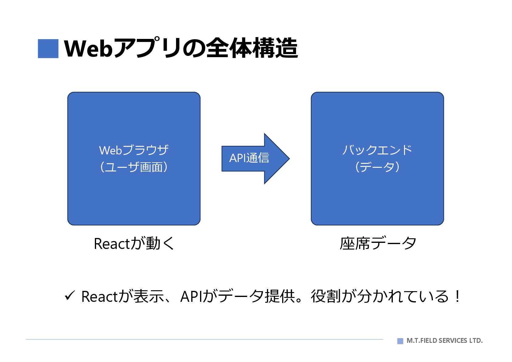 M.T.FIELD SERVICES LTD. Webアプリの全体構造 ü Reactが表⽰、APIがデータ提供。役割が分かれている︕ Webブラウザ (ユーザ画⾯) バックエンド (データ)