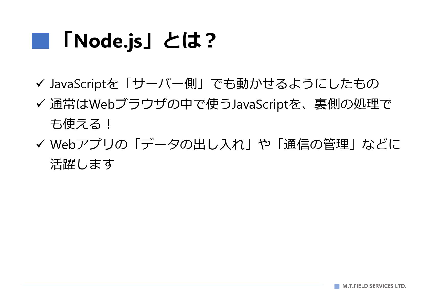 M.T.FIELD SERVICES LTD. 「Node.js」とは︖ ü JavaScriptを「サーバー側」でも動かせるようにしたもの ü 通常はWebブラウザの中で使うJavaScriptを、裏側の処理で も使える︕ ü