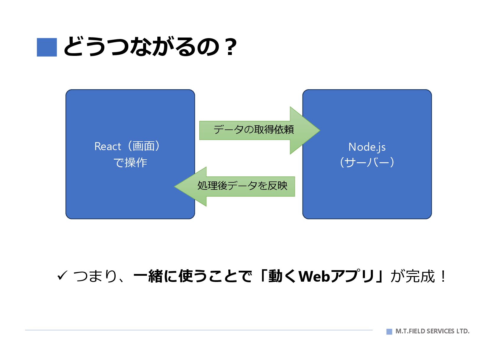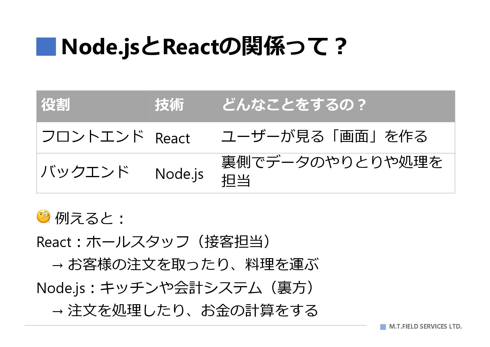 M.T.FIELD SERVICES LTD. Node.jsとReactの関係って︖ 🧐 例えると︓ React︓ホールスタッフ(接客担当) → お客様の注⽂を取ったり、料理を運ぶ Node.js︓キッチンや会計システム(裏⽅)