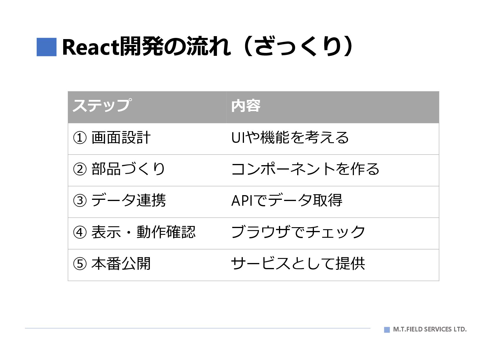 M.T.FIELD SERVICES LTD. React開発の流れ(ざっくり) ステップ 内容 ① 画⾯設計 UIや機能を考える ②