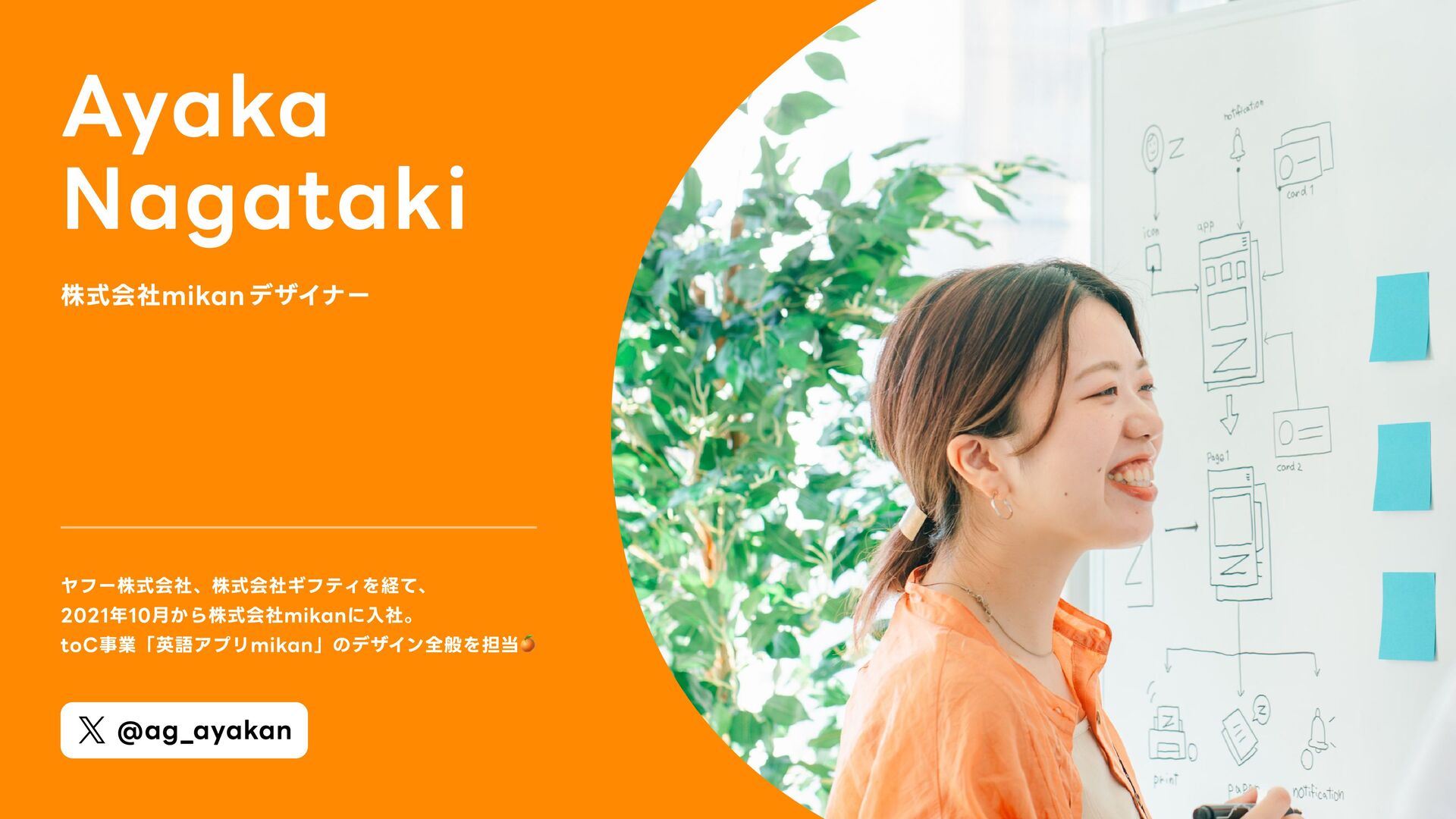Ayaka Nagataki 株式会社mikan デザイナー @ag_ayakan ヤフー株式会社、株式会社ギフティを経て、 2021年10月から株式会社mikanに入社。 toC事業「英語アプリmikan」のデザイン全般を担当