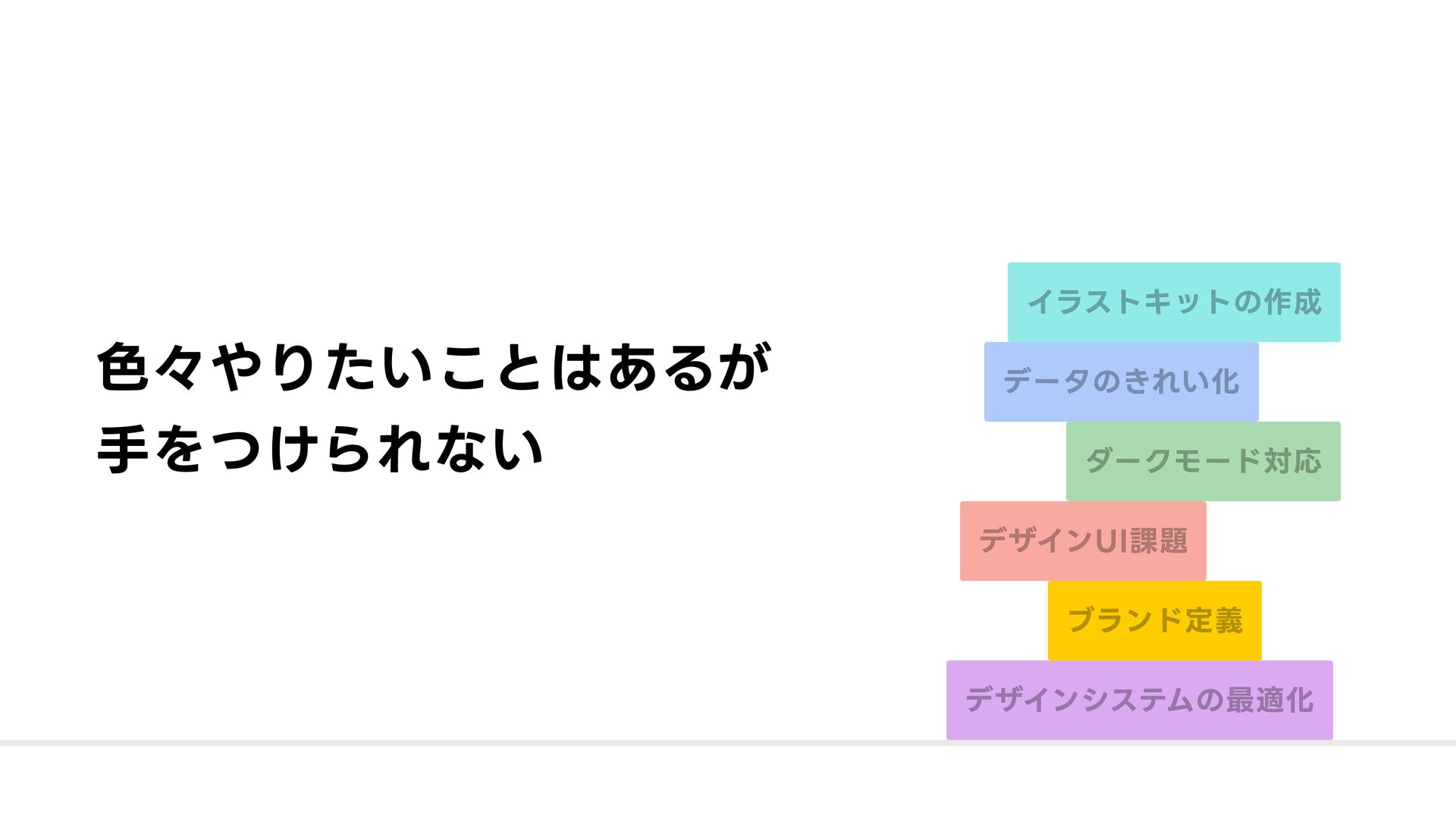 デザインシステムの最適化 ブランド定義 デザインUI課題 イラストキットの作成 ダークモード対応 データのきれい化 色々やりたいことはあるが 手をつけられない