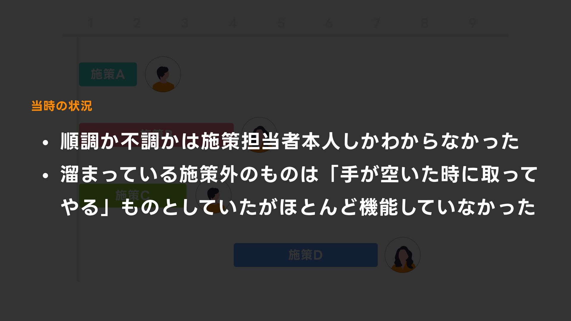 7 8 9 当時の状況 b 順調か不調かは施策担当者本人しかわからなかっD b 溜まっている施策外のものは「手が空いた時に取って やる」ものとしていたがほとんど機能していなかった