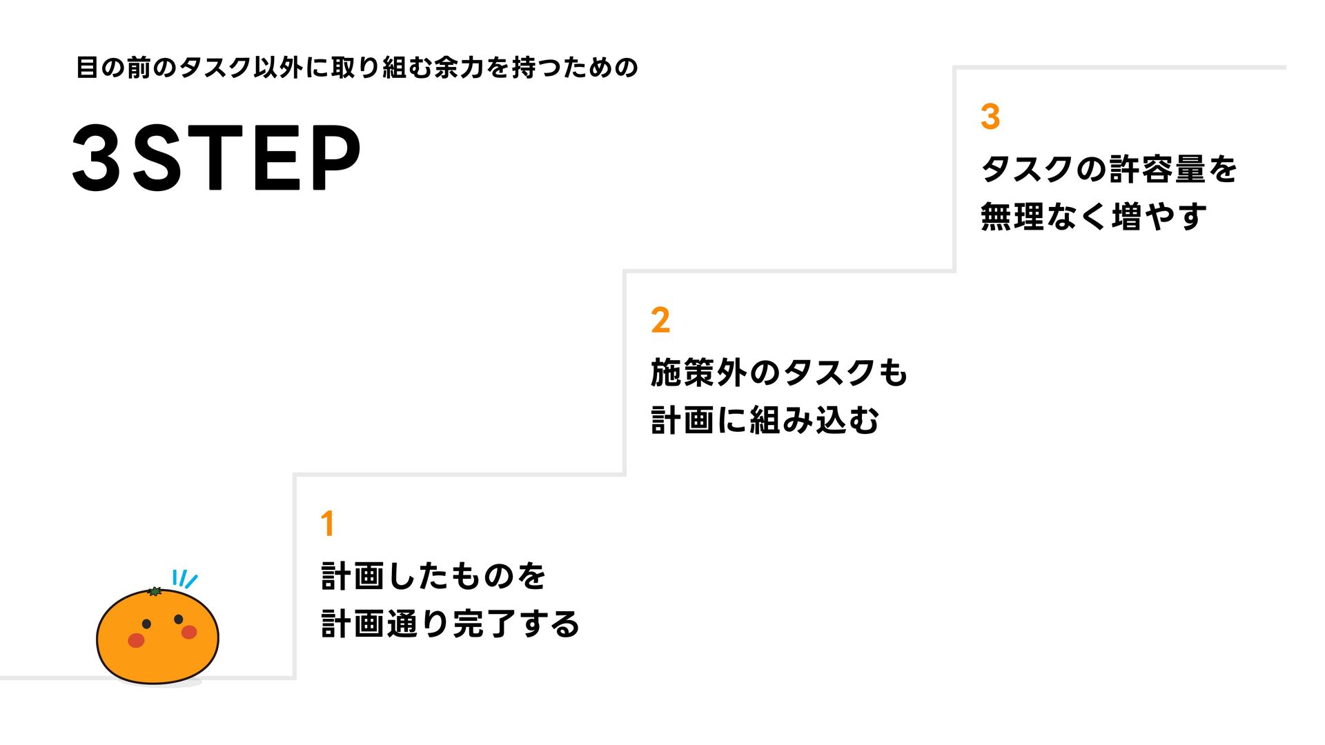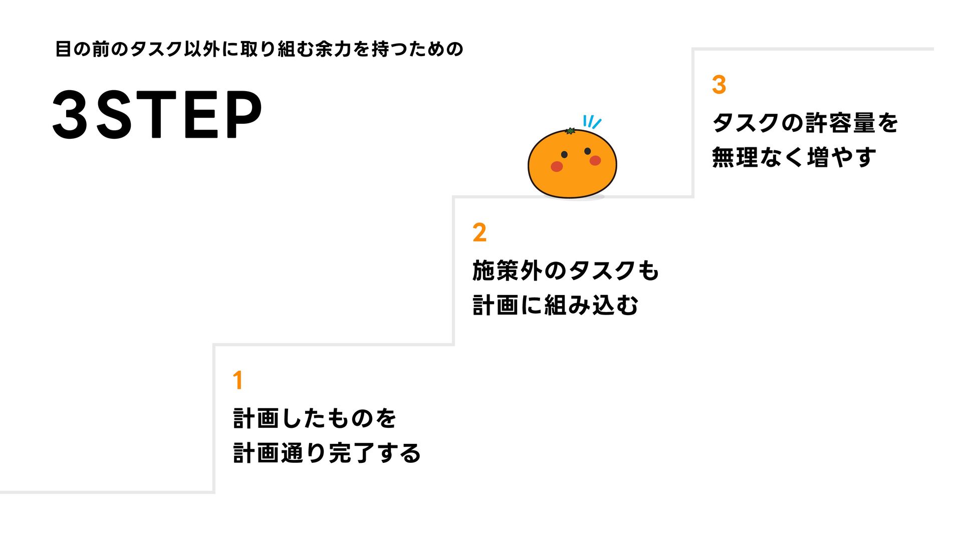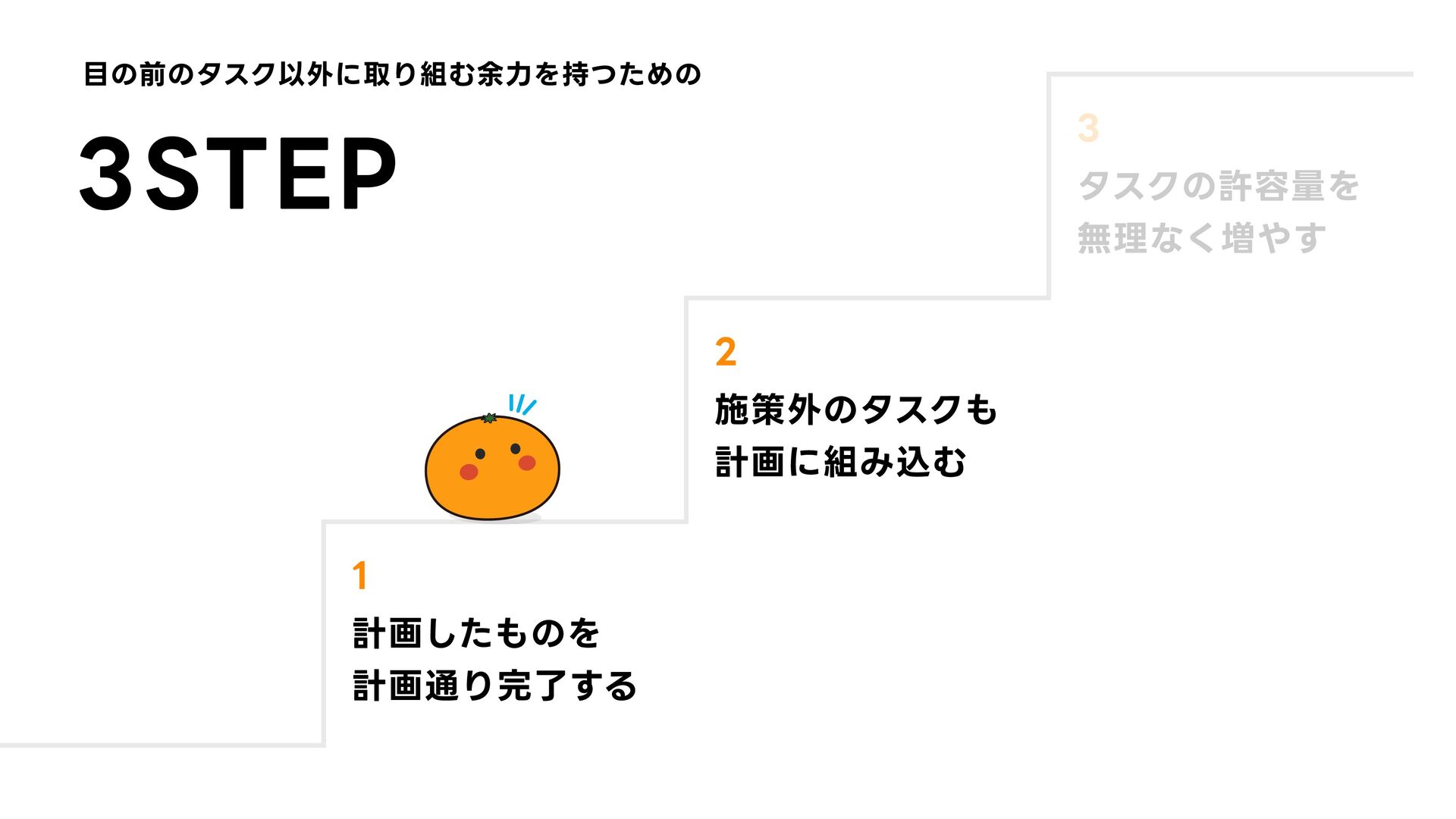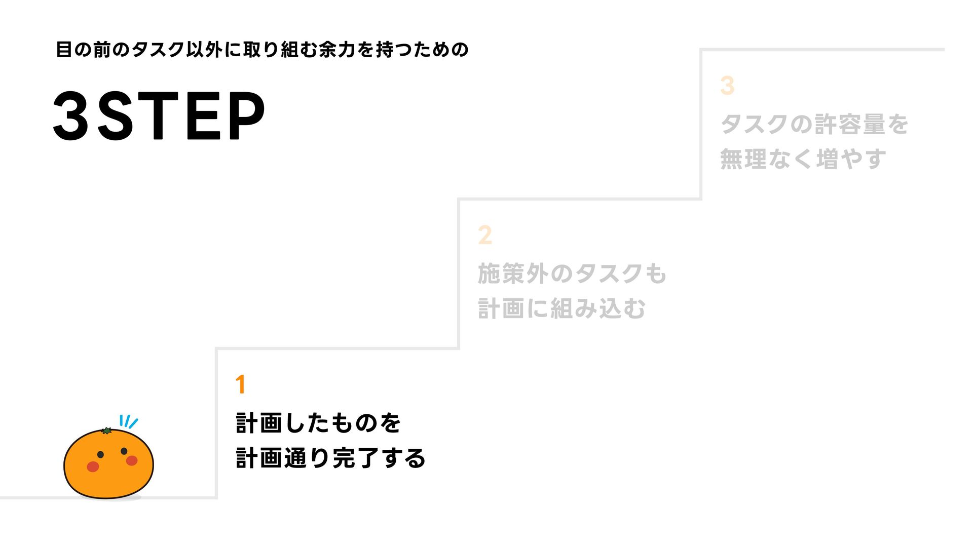 目の前のタスク以外に取り組む余力を持つための 3STEP 1 計画したものを 計画通り完了する 2 施策外のタスクも 計画に組み込む