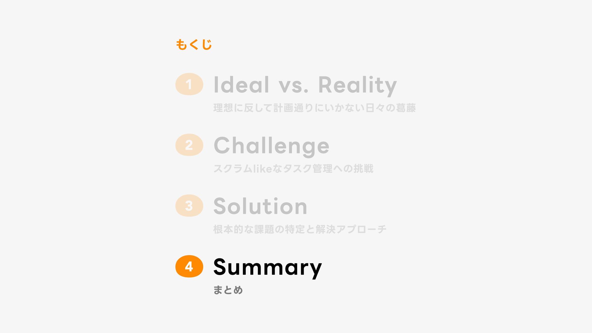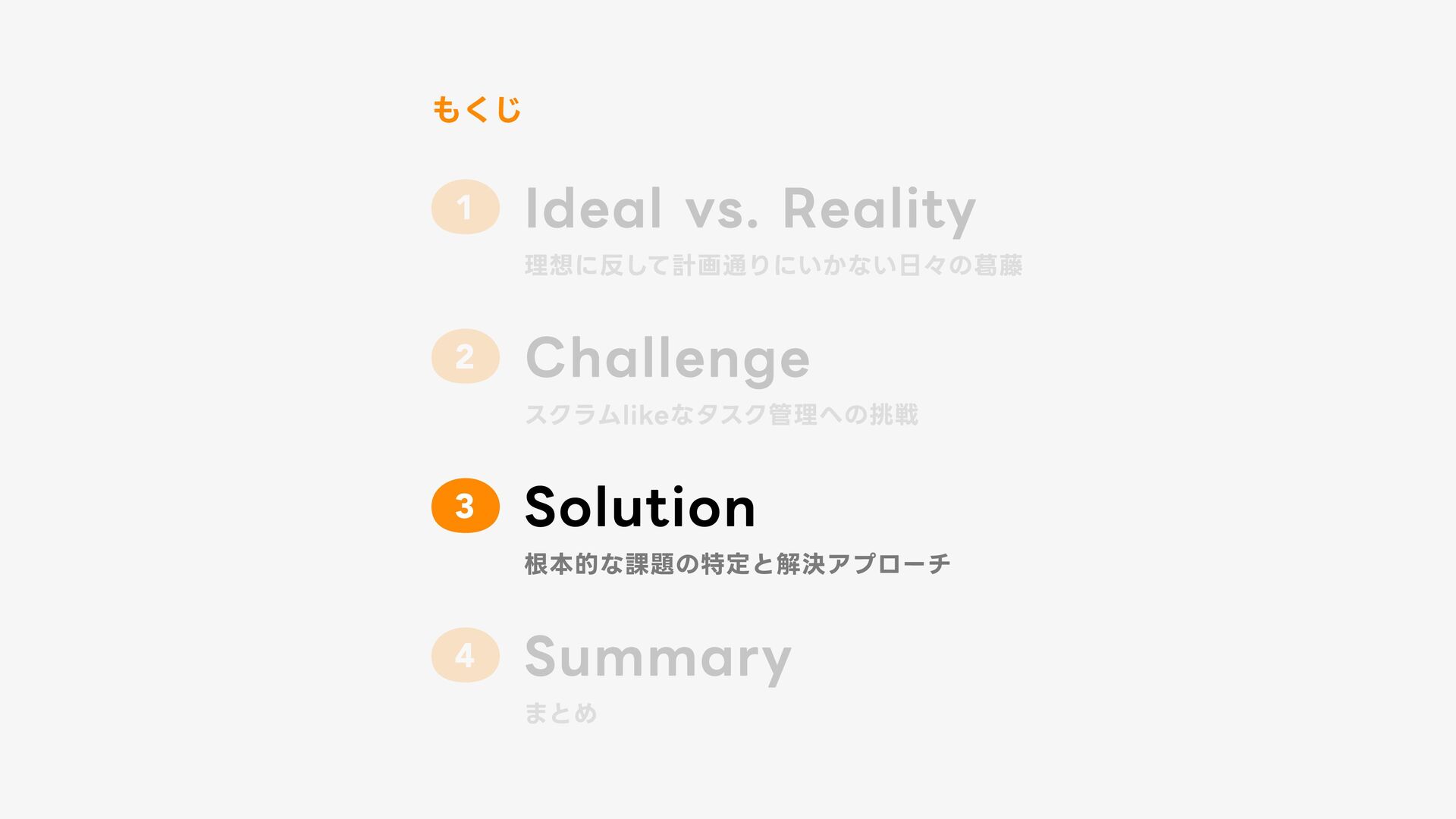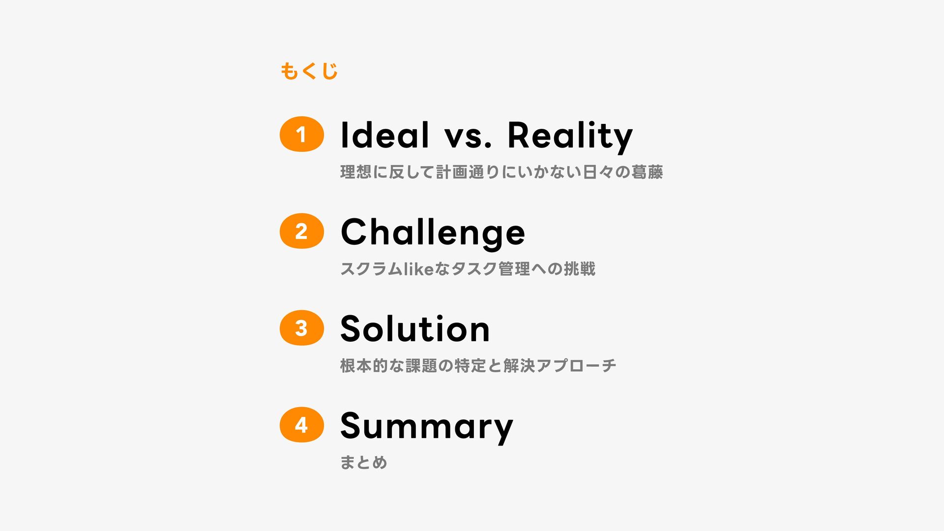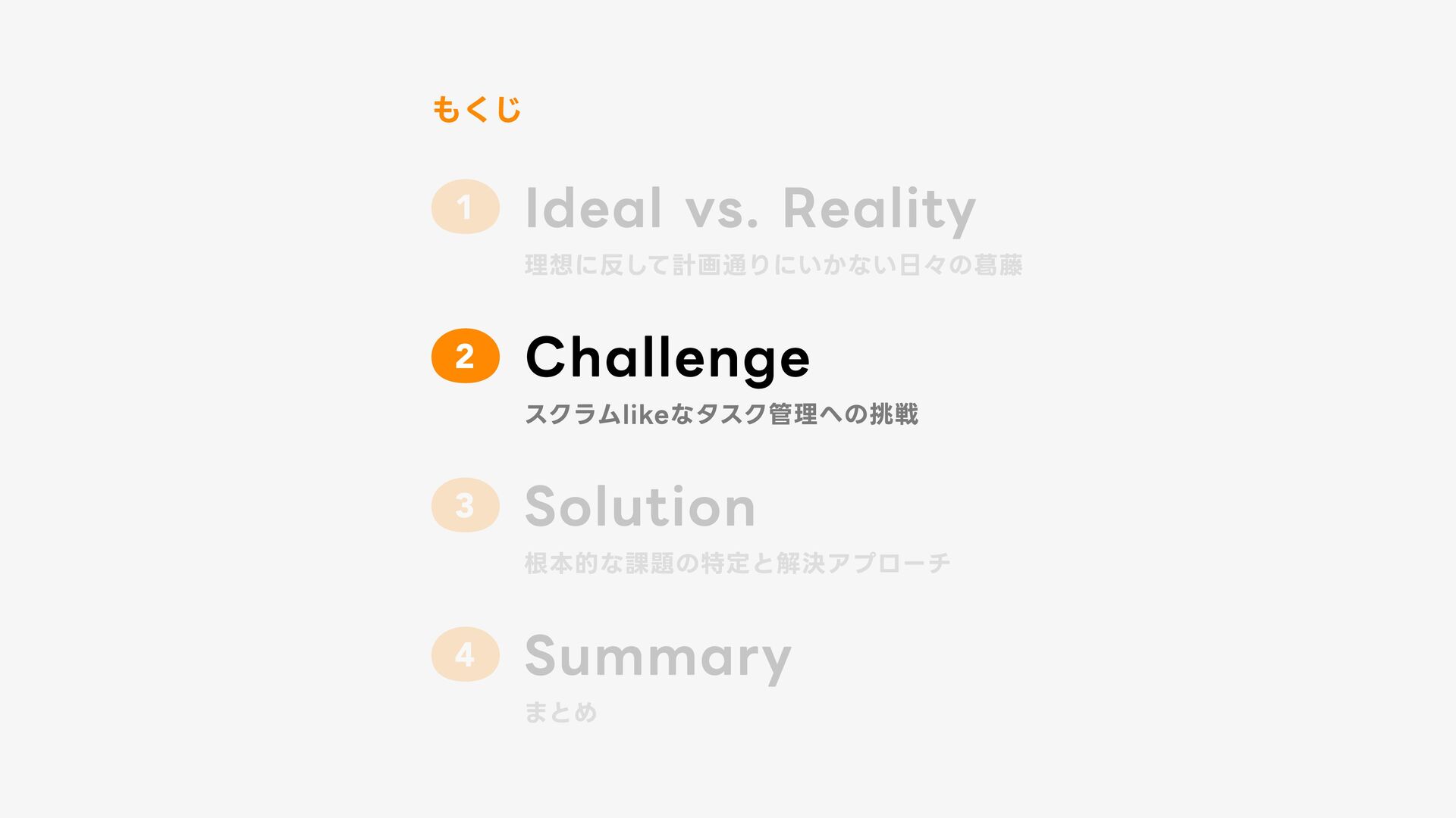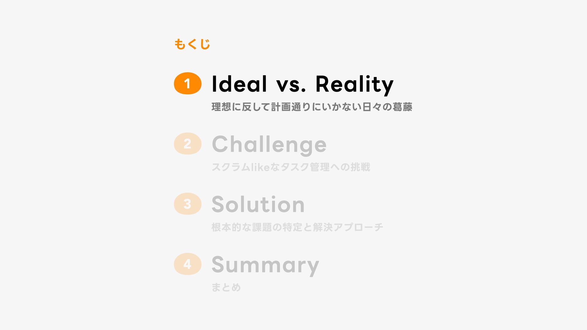 もくじ 1 Ideal vs. Reality 理想に反して計画通りにいかない日々の葛藤 2 Challenge スクラムlikeなタスク管理への挑戦 3