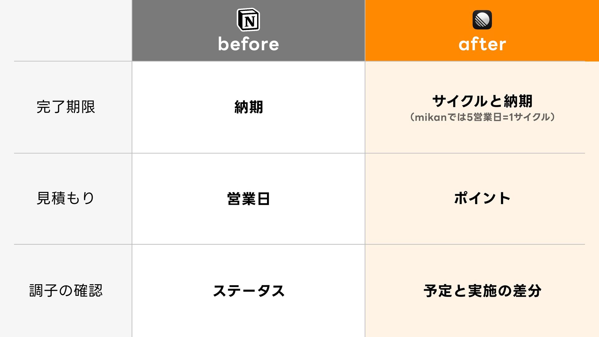 納期 営業日 ステータス 予定と実施の差分 ポイント サイクルと納期 (mikanでは5営業日=1サイクル) 完了期限 見積もり 調子の確認