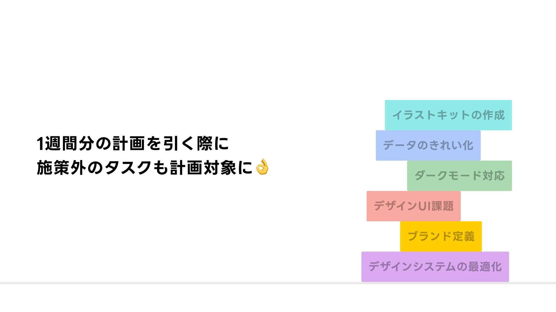デザインシステムの最適化 ブランド定義 デザインUI課題 イラストキットの作成 ダークモード対応 データのきれい化 1週間分の計画を引く際に 施策外のタスクも計画対象に