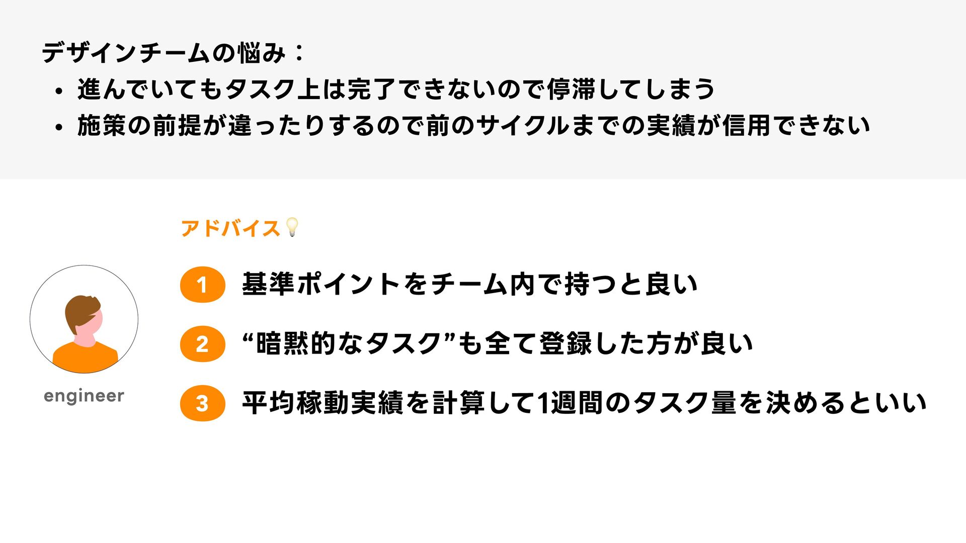 アドバイス 1 基準ポイントをチーム内で持つと良い 2 “暗黙的なタスク”も全て登録した方が良い 3 平均稼動実績を計算して1週間のタスク量を決めるといい engineer デザインチームの悩みd w