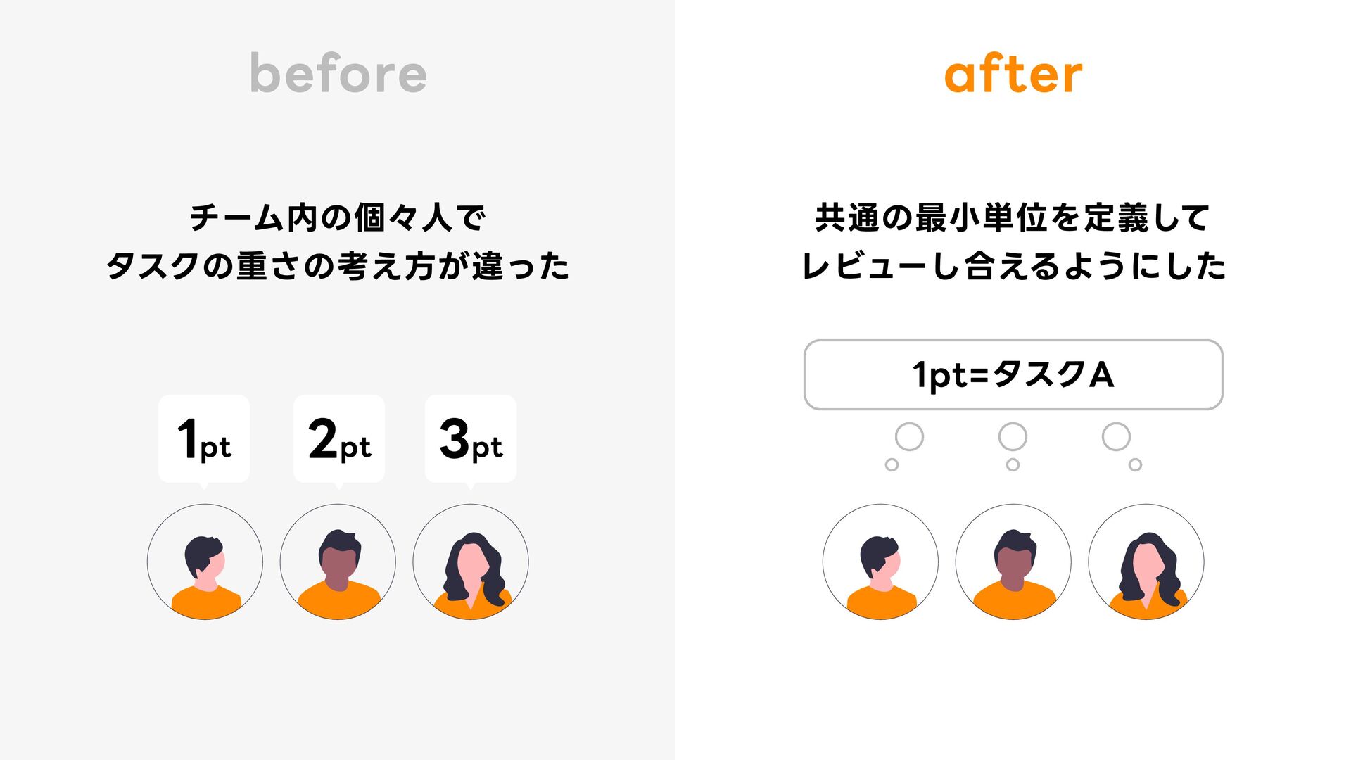 before after チーム内の個々人で タスクの重さの考え方が違った 共通の最小単位を定義して レビューし合えるようにした 1pt=タスクA 1pt 2pt 3pt