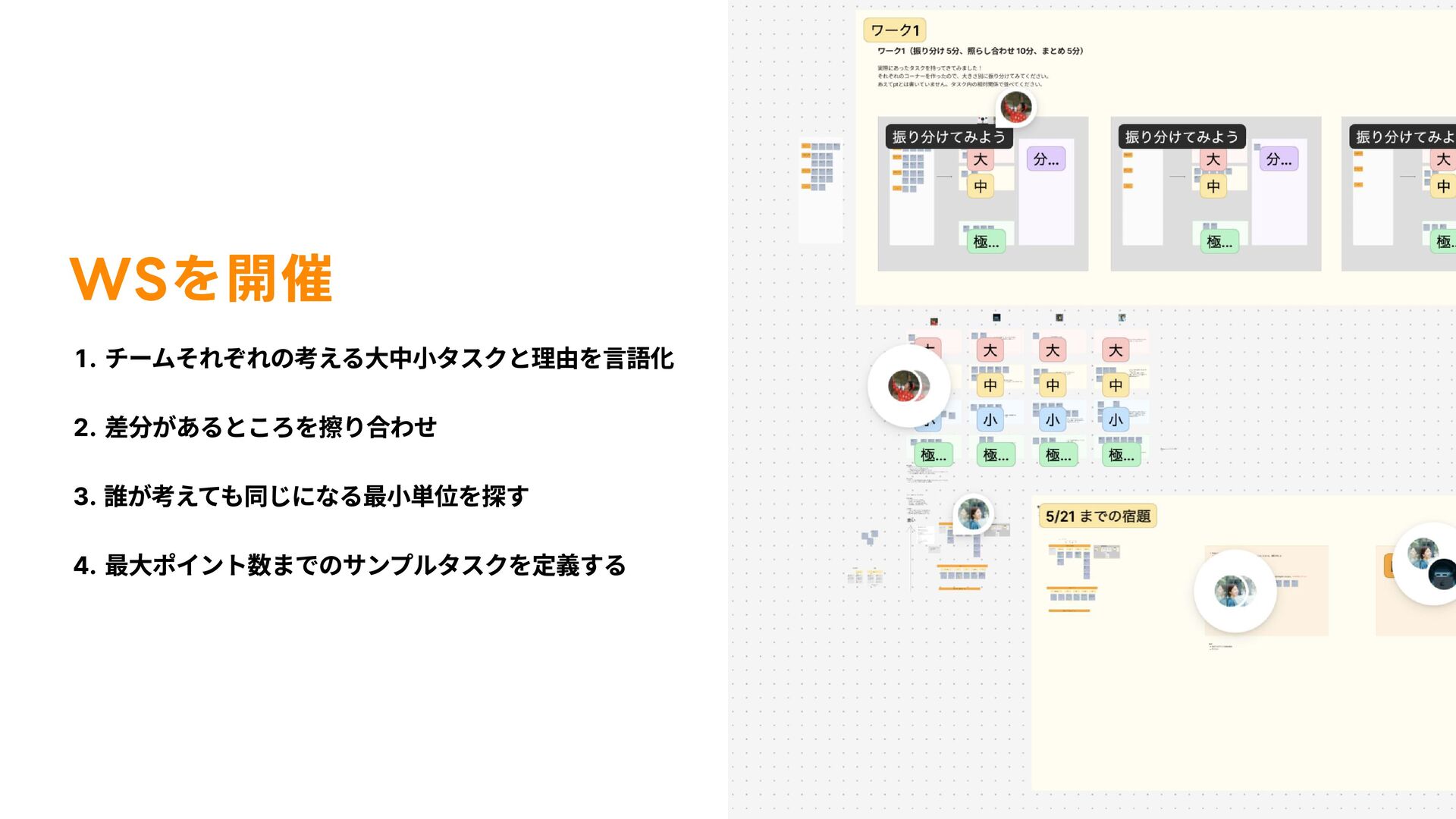WSを開催 #' チームそれぞれの考える大中小タスクと理由を言語化 E' 差分があるところを擦り合わせ g' 誰が考えても同じになる最小単位を探す ' 最大ポイント数までのサンプルタスクを定義する